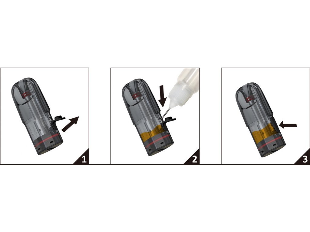 Upozornění: Po naplnění doporučujeme alespoň pět minut počkat, aby se vata uvnitř žhavící hlavy stihla nasáknout e-liquidem.