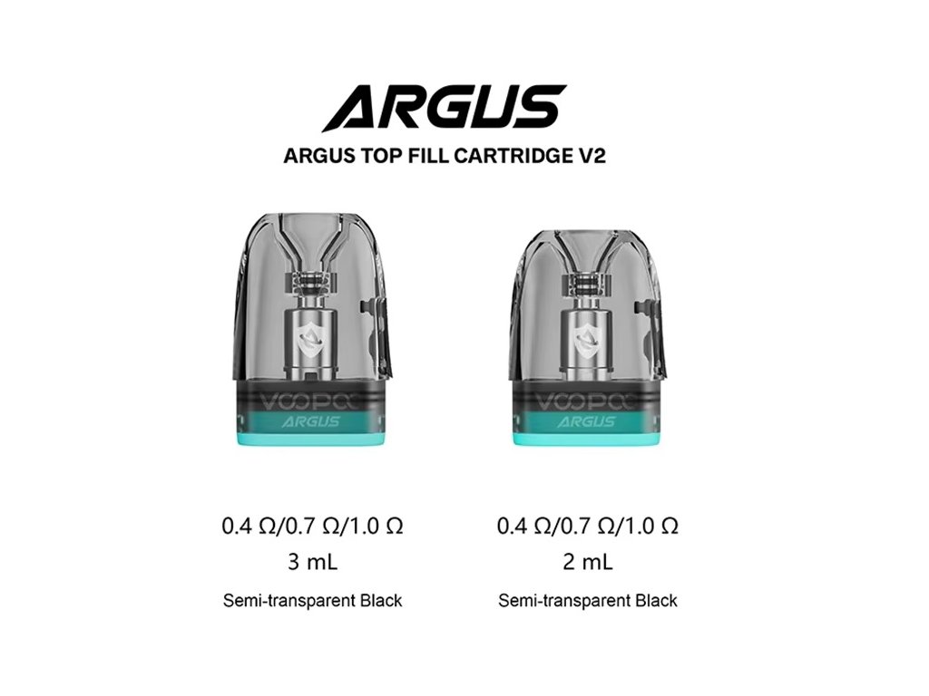 Náhradní cartridge VooPoo Argus Pod Top Fill V2 disponuje velkým objemem 2ml. Jedná se o kompletně vybavenou cartridge disponující integrovanou žhavící hlavou s mesh pletivem pro skvělé podání chuti, rychlý náběh žhavení a optimální produkci páry. Disponuje novým systémem horního plnění s boční silikonovou záslepkou.