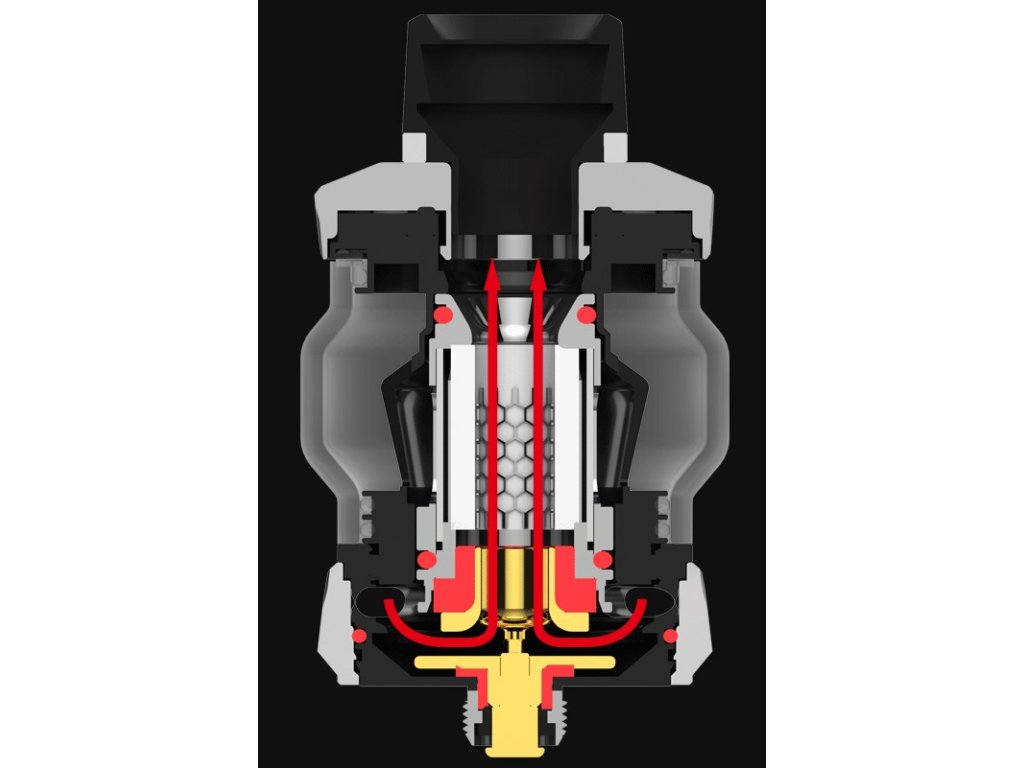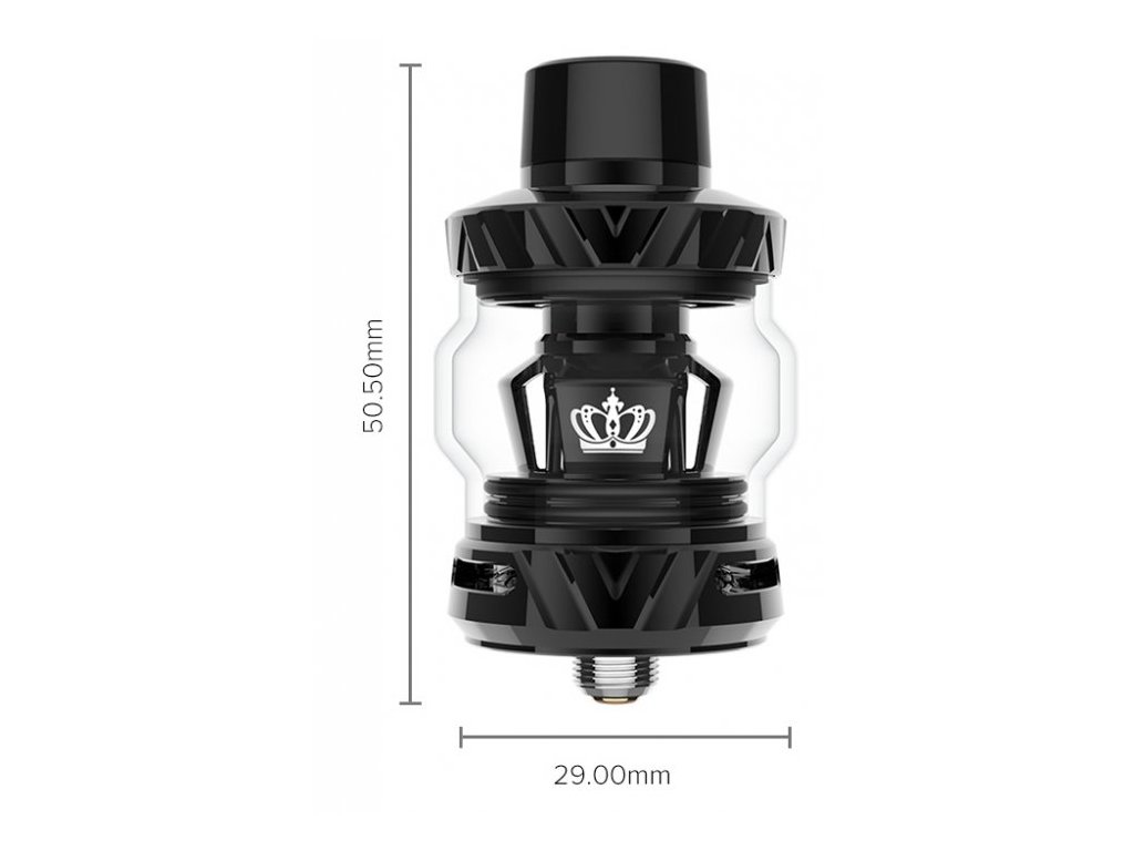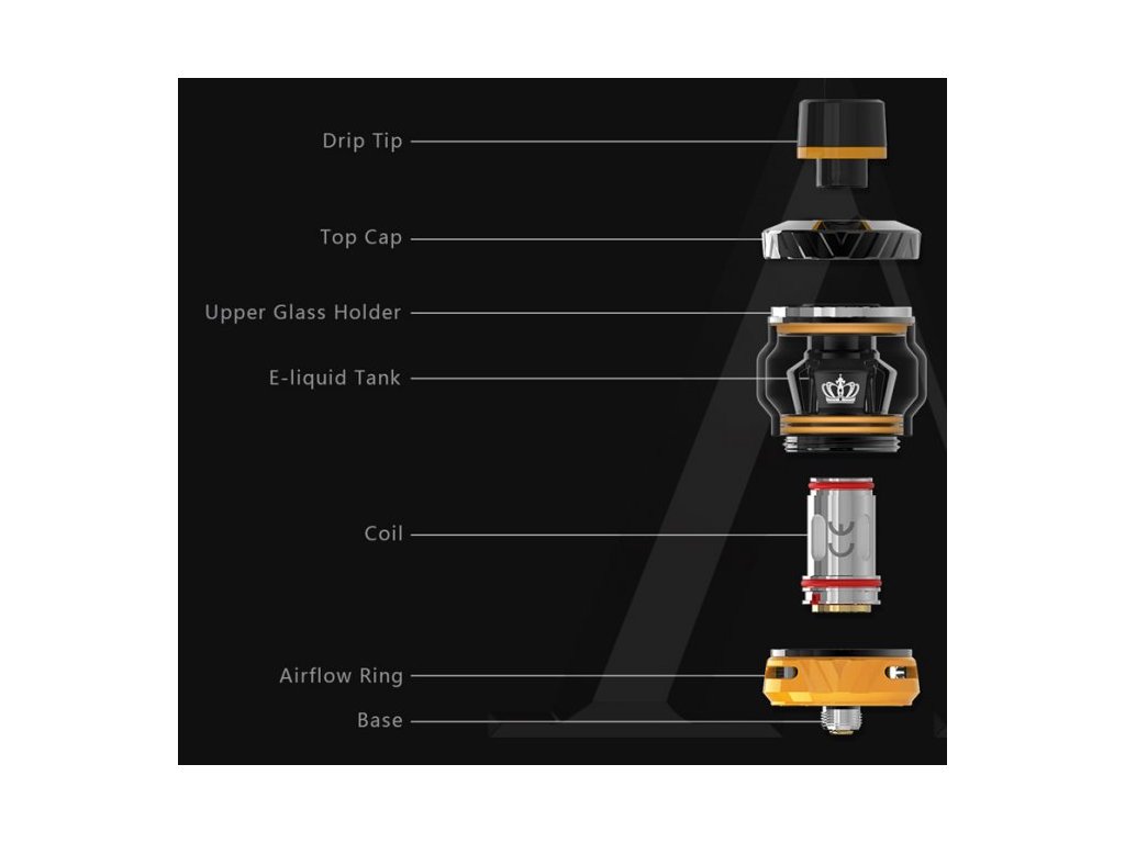 Clearomizéry řady Crown od společnosti Uwell představují po roce již pátou verzi tohoto oblíbeného sub-ohmového clearomizéru, který disponuje patentovanou samočisticí technologií, která absorbuje vytékající e-liquid v základně a následně ho dopraví do žhavící hlavy k odpařování. Využívá systém horního plnění - po odšroubování vrchní části plníte e-liquid otvorem přímo do těla clearomizéru o objemu 5ml, který nově minimalizuje protékání díky zpětnému ventilu z prvotřídního silikonu. Celý clearomizér je plně rozebíratelný = snadná údržba. Regulace přívodu vzduchu pro nastavení optimální kouřivosti se nachází ve spodní části. Žhavící hlavy typu Mesh nabízí Crown 5 o odporech 0,23ohm a 0,3ohm. Nízkoodporový clearomizér určený pro přímé potahování rovnou do plic (DL).