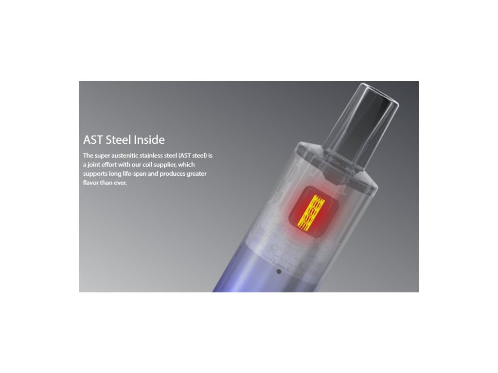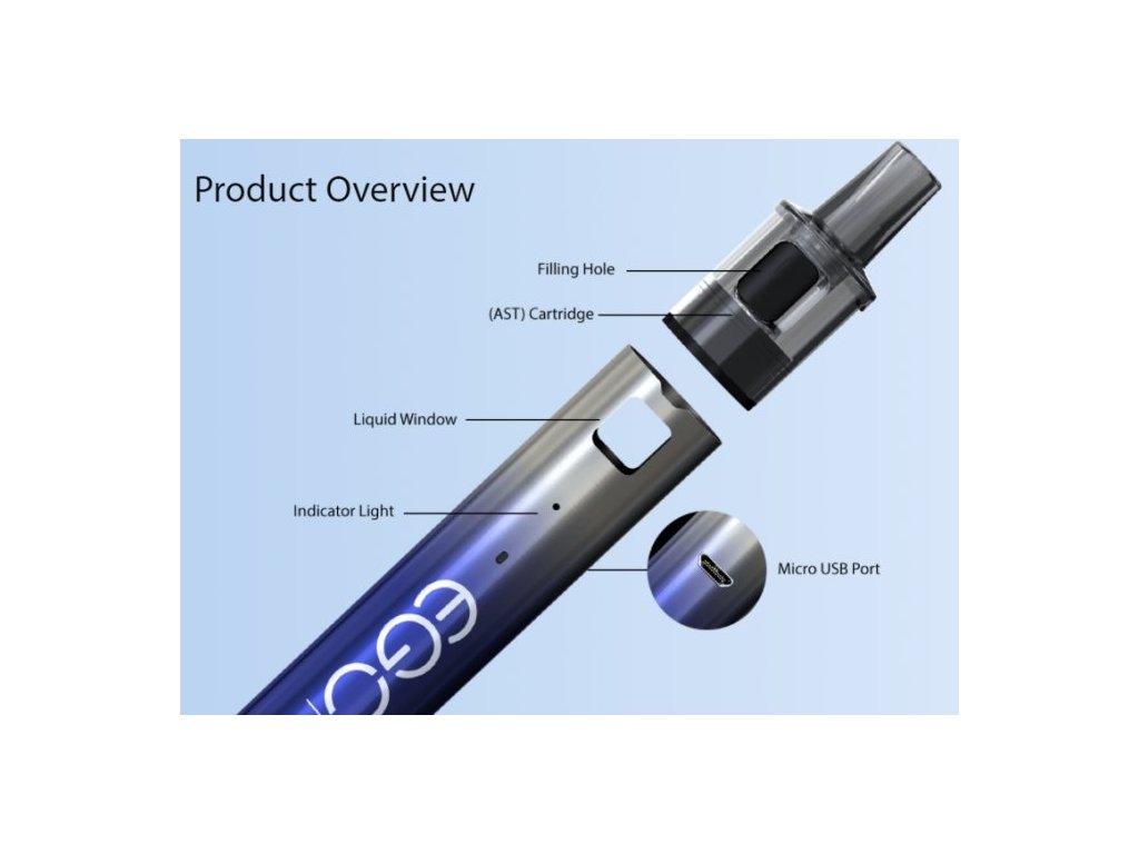 Joyetech eGo AIO AST Pod patří do tzv. skupiny kapesních elektronických cigaret, jejichž výhodou jsou kompaktní rozměry, autentické podání chuti a nízká pořizovací cena. Tělo baterie disponuje zabudovaným monočlánkem o kapacitě 1000mAh s automatickým spínačem a konstantním napětím pro stabilní výkon. Čip AVATAR IC 1.0 přináší ochranu proti zkratu, přehřátí a vybití, či 8 vteřinovou ochranu žhavení. Vyměnitelná cartridge (POD) se žhavící hlavou o odporu 1ohm pojme až 2ml e-liquidu. Nabíjení umožňuje micro USB vstup. Tato inovace je vhodná pro kouření ve stylu MTL, tedy klasického šlukování pusa-plíce.