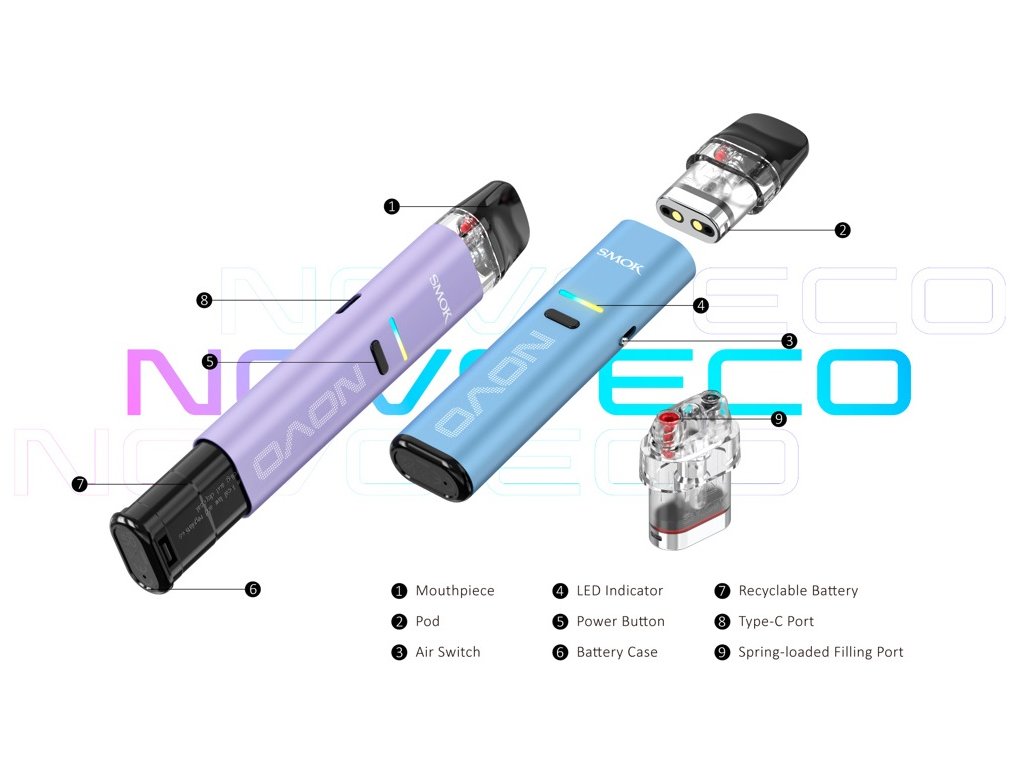 NOVO ECO nabízí v rámci své kategorie zcela inovativní funkce, které ocení začátečník i pokročilý vaper hledající základní e-cigaretu s automatickými funkcemi. Jedná se o nesmírně jednoduchý pod systém na používání i údržbu. Je v základu velice podobný jednorázovým e-cigaretám, avšak díky pokročilým funkcím se navíc umí s každým potáhnutím přizpůsobit vašim preferencím. Pouhým stiskem jediného tlačítka si přepínejte mezi režimy nízkého a vysokého výkonu, nebo pomocí manuální regulace Airflow přecházejte z utaženého šlukování až do volnějšího RDL stylu. Možnostem se meze nekladou. Mezi další vychytávky patří vyjímatelná baterie pro snadnou recyklaci nebo například nová řada cartridgí s automatickým uzavíráním plnícího otvoru. NOVO ECO toho nabízí k prozkoumání opravdu hodně.