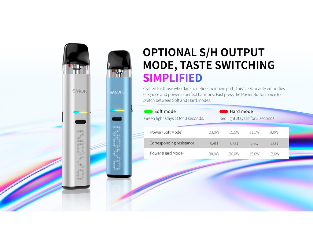 Bleskové přepínání výkonu - Inteligentní elektronika automaticky rozpozná typ připojené cartridge a nastaví vhodný výstupní výkon. Zároveň automaticky aktivuje žhavení při každém potáhnutí z náustku. Novo Eco se tak v podstatě ovládá úplně stejně jako jednorázová cigareta. Avšak pouhým stiskem jediného tlačítka umí přepínat mezi režimy nízkého a vysokého výkonu, čímž získáte jedinečnou možnost přizpůsobit si chuť i výslednou páru vašim preferencím.