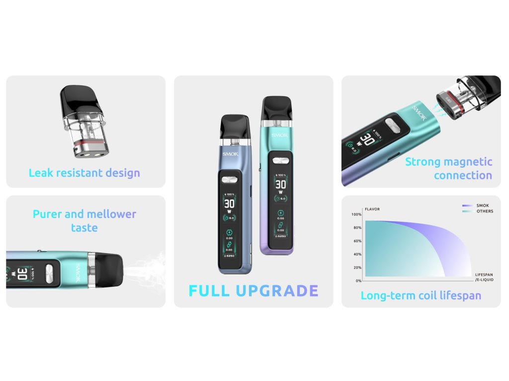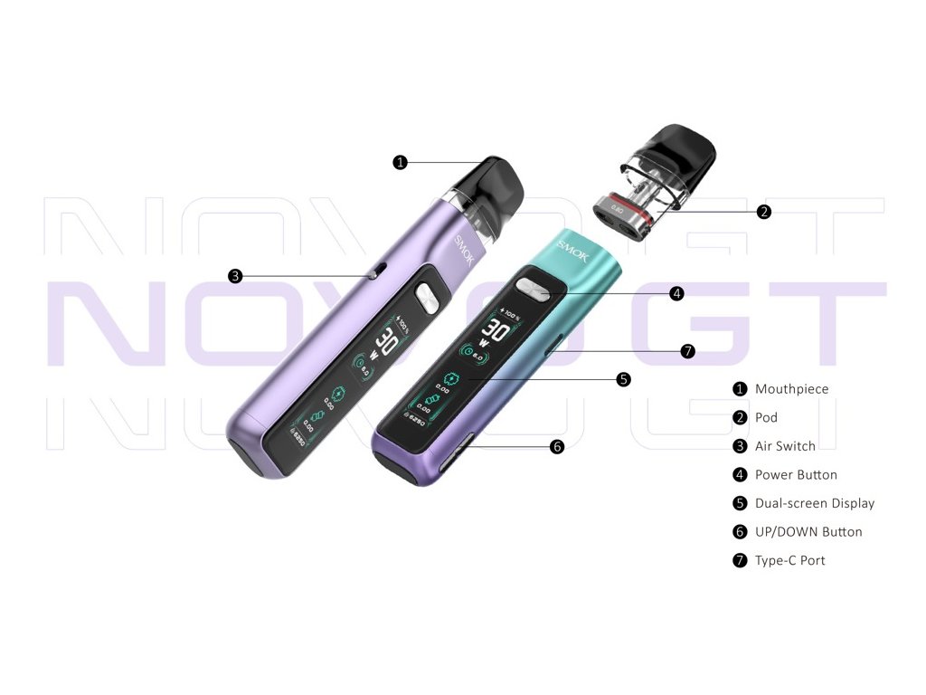 Vstupte do světa vapování s nejnovějším počinem ikonické značky SMOK - modelem NOVO GT Kit. Jedná se o moderní pod systém zaměřený na začínající vapery a všechny uživatele, kteří preferují vyladěnou e-cigaretu s automatickými funkcemi. Elegantní společník, který je stejně příjemný na dotyk i na pohled, dostal do výbavy vestavěnou baterií s kapacitou 1300 mAh a maximální výkon až 30 W, který lze navíc dále regulovat podle vašich preferencí. Jedinečný displej s dvojitou obrazovkou přináší zcela nový vizuální zážitek a efektivitu ovládání. Vyladěnost celku podtrhují inovované cartridge s bohatým a čistým chuťovým podáním.