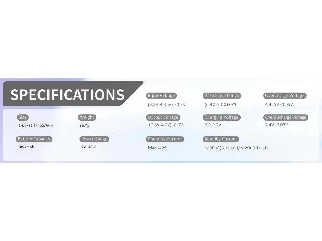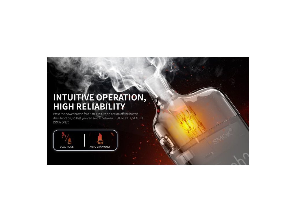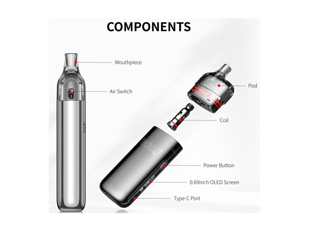 Elektronická cigareta s POD systémem Tech247 Vás na první pohled zaujme dokonalým ergonomickým tvarem baterie s nadupaným vestavěným monočlánkem o kapacitě 1800mAh, který aktivujete spínacím tlačítkem nebo pouhým potahem z cartridge. Tech247 dále disponuje moderním IQ čipem, který za Vás nastaví ideální výkon dle stavu nabití baterie a odporu žhavící hlavy nebo aktivuje ochranu proti přehřátí a podbití, či 8-mi vteřinovou ochranu žhavení. Na boční straně baterie najdete přehledný OLED displej se všemi potřebnými informacemi o nastavení, včetně možnosti nastavení výkonu od 5W do 30W. Cartridge Tech247 nabízejí 4ml objem a postranní airflow, který je regulován pomocí speciální páčky. Tento model je vybaven novými žhavícími hlavami M-Coil Meshed o odporu 0,6ohm a 0,8ohm.