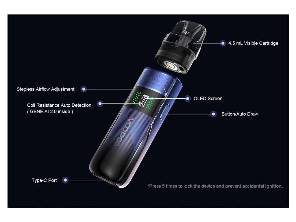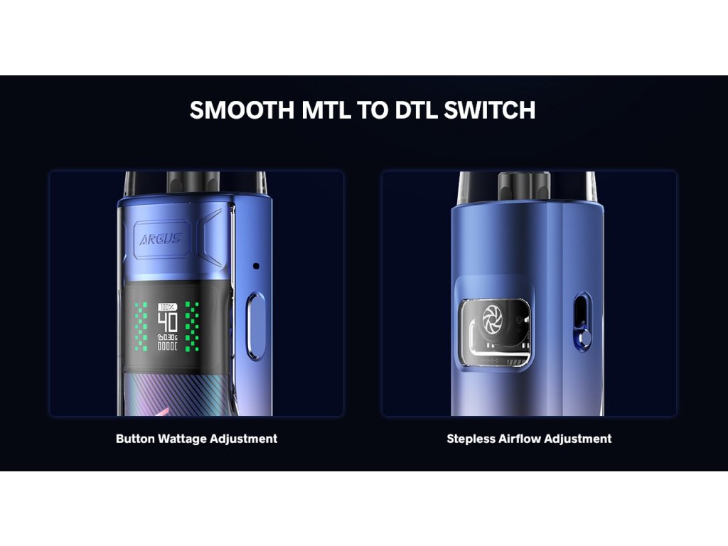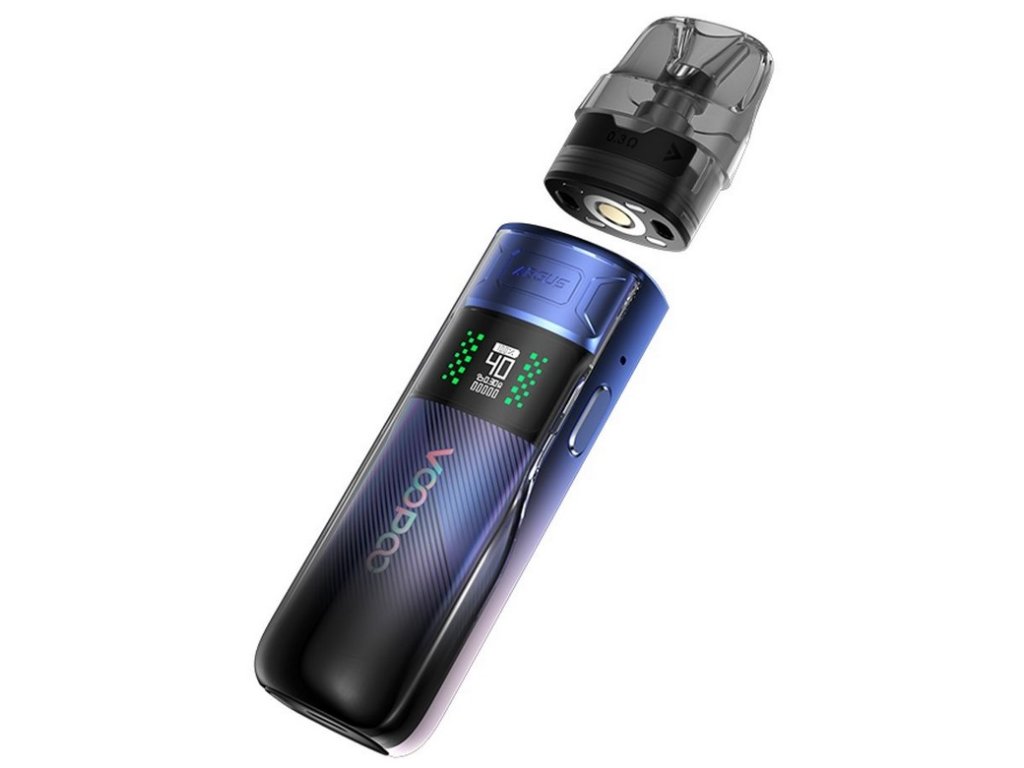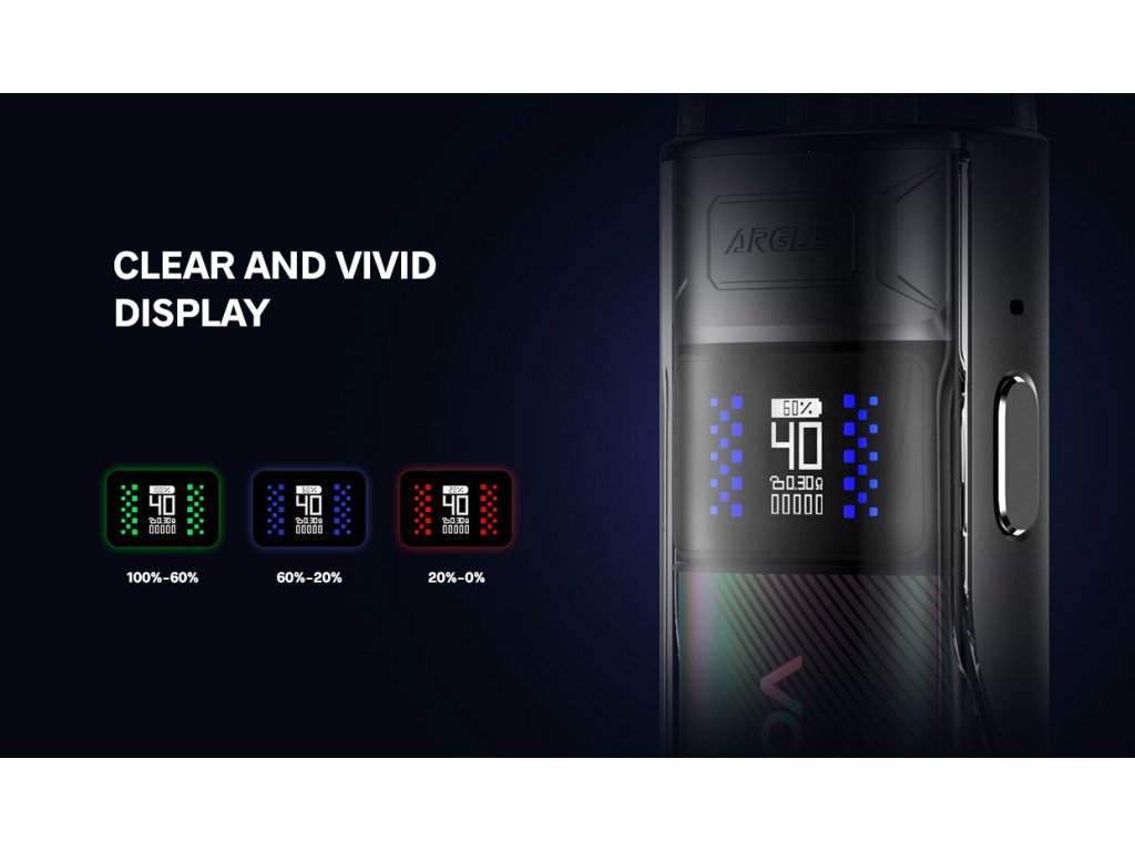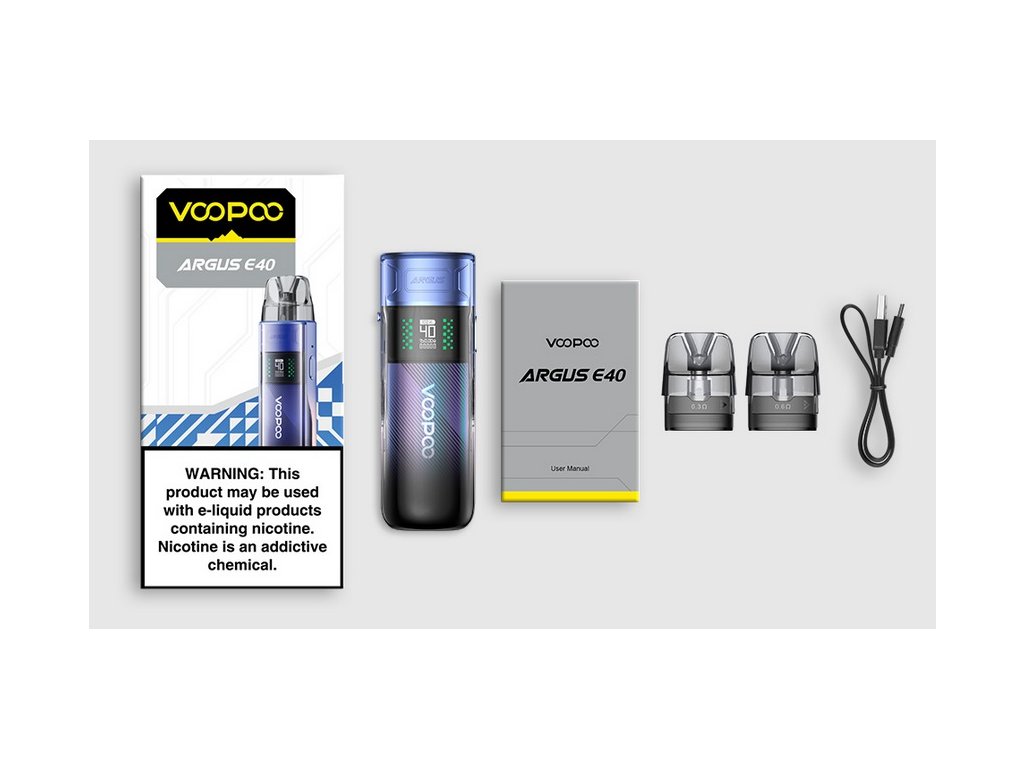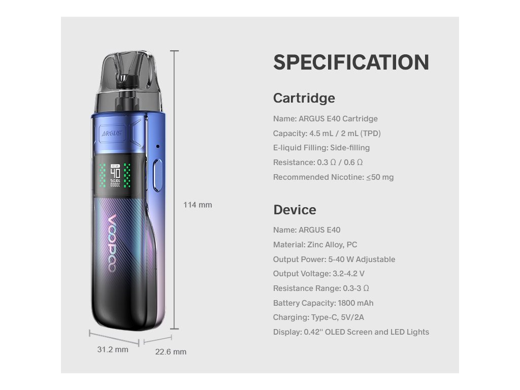 Společnost VOOPOO si pro Vás připravila zbrusu nový model elektronické cigarety řady ARGUS s označením E40, která vás na první pohled zaujme svým futuristickým zpracováním. V ergonomickém těle baterie se nachází zabudovaný monočlánek o kapacitě 1800mAh s USB-C nabíjením. Přední panel baterie zdobí displej, který zobrazuje všechny potřebné informace o nastavení zařízení, včetně nastavitelného výkonu až 40W. Pro aktivaci baterie stačí pouze potáhnout z náustku nebo použít spínací tlačítko. Stejnojmenné cartridge o objemu 4,5ml s bočním plněním disponují odporem 0,3ohm a 0,6ohm. Pro dokonalé doladění chuti a kouřivosti poslouží boční Airflow.