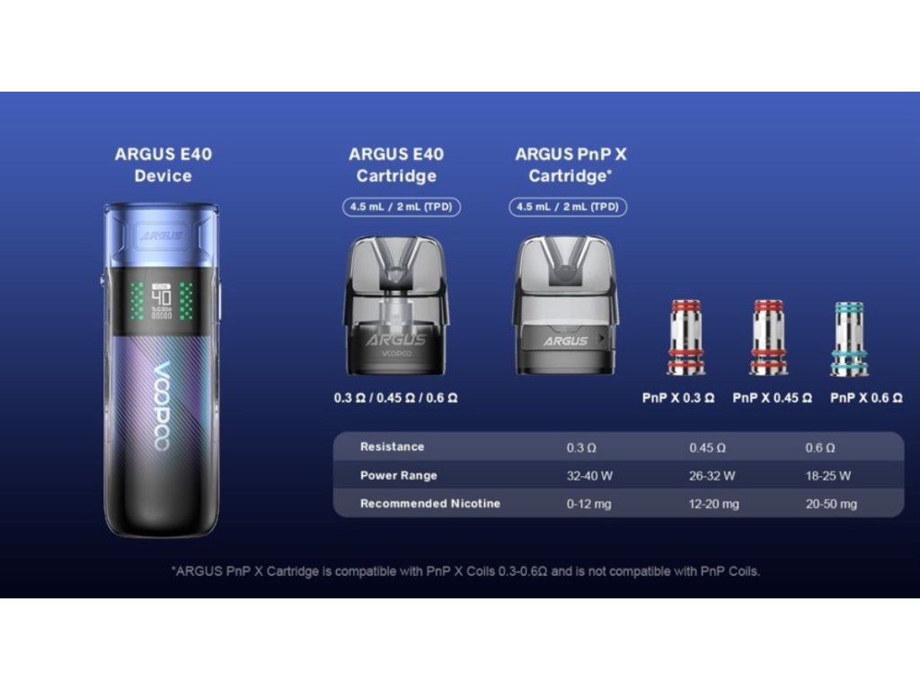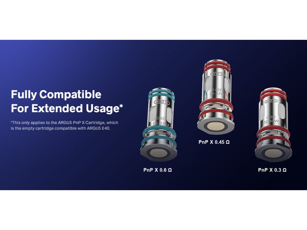 Žhavící hlavy VooPoo PnP-X: VooPoo Argus E40 Pod je dalším zařízením z rozrůstající se platformy PnP-X. V základním balení najdete cartridge s integrovanou hlavou, samostatně si však můžete k zařízení pořídit také prázdnou cartridge, která je kompatibilní se žhavícími hlavami z platformy VooPoo PnP-X s odporem vyšším než 0,3 ohm. Díky tomu získáte větší svobodu při výběru vhodných součástí pro každodenní využití.