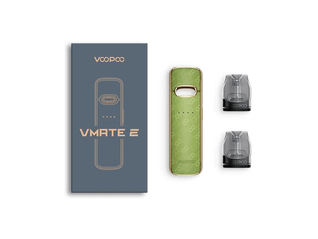 VooPoo VMATE E Pod Kit je luxusně zpracovaná e-cigareta pro klasické šlukování, která nádherně doplňuje celou sérii VMATE. Jedná se o zajímavý model zejména z hlediska estetiky, nabídne však také velice solidní parametry v čele s velkou kapacitou baterie, díky čemuž si její používání velice snadno oblíbíte. Samotné tělo je vyrobeno z kombinace zinkové slitiny a kůže. K dostání je ve třech barvách s tradiční šedou konstrukcí, nebo ve třech barvách pro náročnější, které nabídnou kovovou konstrukci s pozlaceným povrchem pro co nejstylovější vzhled. Rozměry těla činí 99,5 x 30,5 x 17 mm, díky svému ergonomickému zpracování a kompaktním rozměrům padne e-cigareta perfektně do ruky a pohodlně se užívá. Hlavní výsadou je potom speciální krytka náustku ve vrchní části, která zabraňuje vniknutí nečistot při cestování, nebo při každodenním používání, do samotného náustku. E-cigaretu tak můžete neustále udržovat v čistotě a užívat si pohodový vaping naprosto kdykoliv.