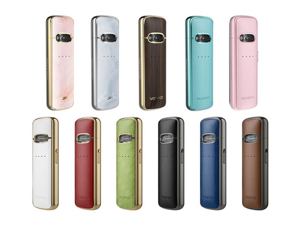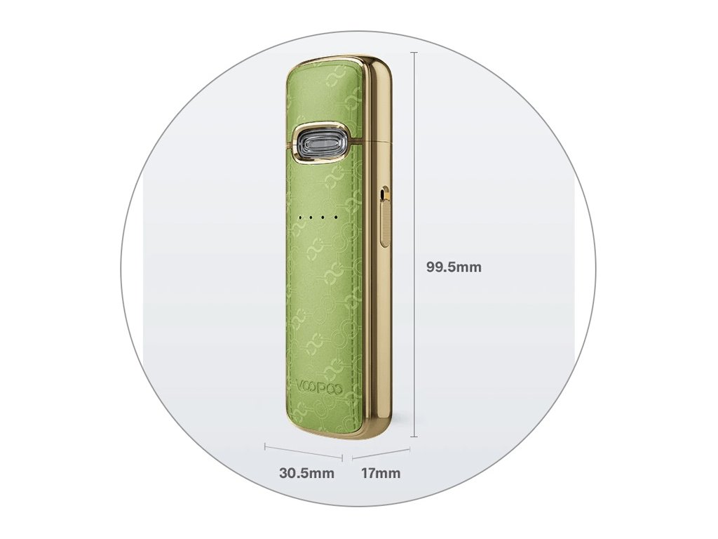 Nádherný design: VooPoo VMATE E Pod Kit je nádherně zpracovaná a stylová e-cigareta, která přichází na scénu hned v šesti barvách. Tělo je vyrobeno z kombinace zinkové slitiny a kůže, na výběr budete mít ze tří konvenčních barev s šedou konstrukcí, nebo tři moderní a luxusní barvy s pozlacenou konstrukcí. Rozměry e-cigarety činí krásných 99,5 x 30,5 x 17 mm, díky čemuž se bude příjemně držet v ruce při každodenním používání.