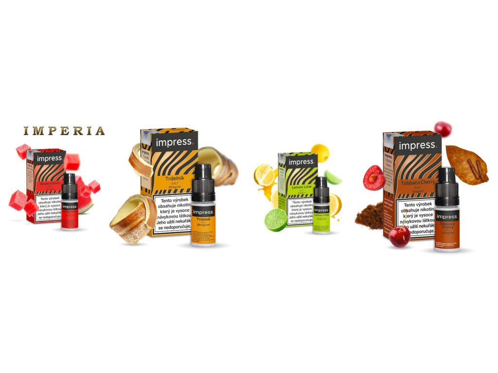 Výrobce Imperia uvádí na trh zajímavou kolekci salt nikotinových e-liquidů Impress. Salt, která nadchne naprosto všechny vapery díky rozmanitým druhům příchutí. V kolekci totiž najdete ovocné směsi, tabákovky i velice chutné dezertovky. Hlavní doménou celé řady jsou originální a promyšlené receptury s vysoce kvalitními ingrediencemi a maximálním důrazem na chuť. Rozhodně na vás udělají dojem.