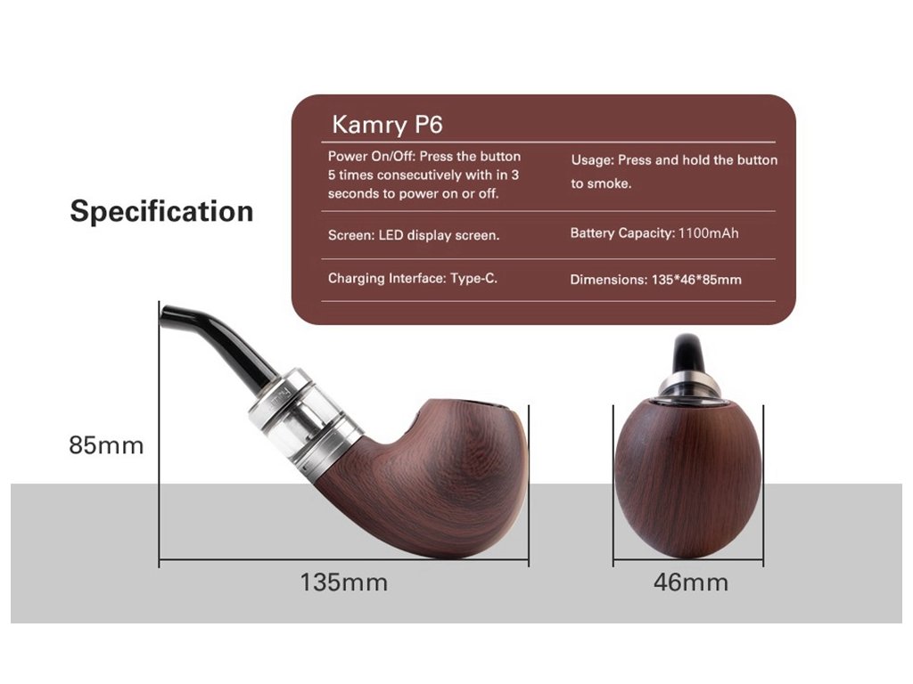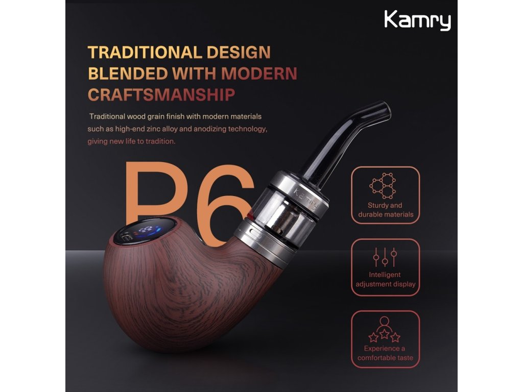 Pro ty, kdo mají slabost pro klasický styl, ale chtějí pohodlí moderní e-cigarety, je Kamry P6 Ebony skvělá volba. Tahle e-dýmka spojuje elegantní vzhled, svižný výkon a jednoduchou obsluhu. V ruce působí poctivě – žádný lehký plast, ale pořádný kus „železa“, jak to má být.