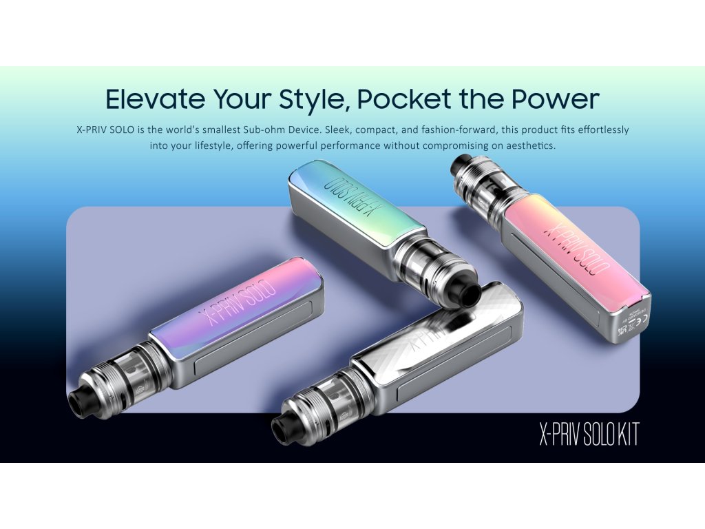 V dnešní době POD systémů nezapomíná Smoktech na milovníky pořádných mraků, a proto představuje grip X-PRIV SOLO, který dokonale spojuje styl a přenosnost v sub-ohmové kategorii. Přední panel je osazen přehledným a barevným displejem, díky kterému je nastavení zařízení jednoduchou a zábavnou záležitostí, nastavení výkonu a ovládání v menu je pomocí dotykových tlačítek na předním panelu. Po otočení o 180 stupňů se nachází pod designovým panelem s magnetickým úchytem prostor pro monočlánek typu 18650. Nastavitelný výkon 5W až 80W, pohodlné boční spínací tlačítko nebo ochrany proti zkratu, přehřátí, přežhavení a nízkému odporu jsou už jen krásnými vlastnostmi tohoto zařízení. Výrobce této sadě přidělil clearomizer TF-D SubTank s vrchním plněním a žhavícími hlavami D-COIL.