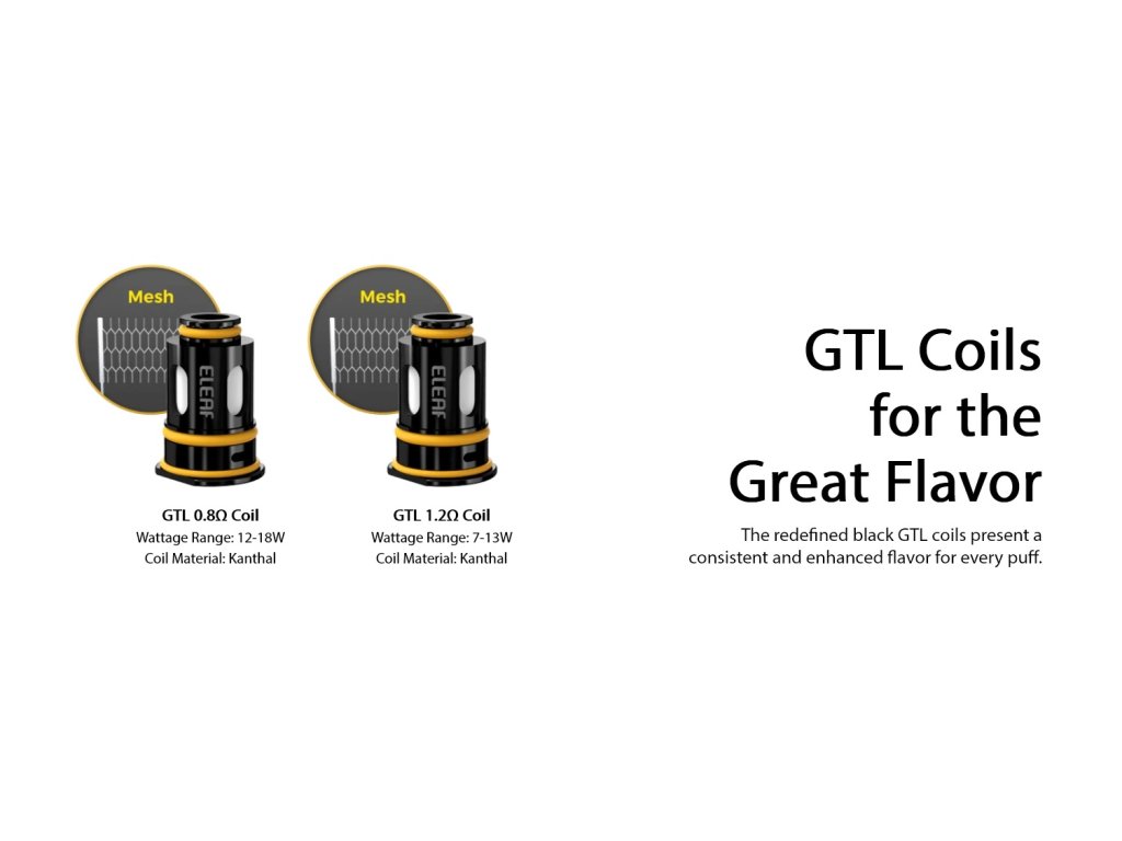 Ve spodní části clearomizéru se nachází praktický systém regulace airflow, otáčením regulačního kroužku si snadno a rychle nastavíte potřebnou tuhost potahu. V základní verzi se jedná o MTL clearomizér. Je totiž kompatibilní se žhavícími tělísky Eleaf GTL, přičemž v balení na vás čekají hned dvě žhavící hlavy z této série v černém provedení. Jedná se o hlavy s odpory 0,8 ohm a 1,2 ohm. Samostatně si pak můžete k modelu zakoupit také hlavu s odporem 0,4 ohm pro rozšíření funkčnosti na utaženější RDL vaping. Eleaf GTL D20 Tank se skvěle hodí zejména pro začátečníky a uživatele, kteří si chtějí vyzkoušet krásy MTL vapingu a poohlíží se po základním a jednoduchém clearomizéru.