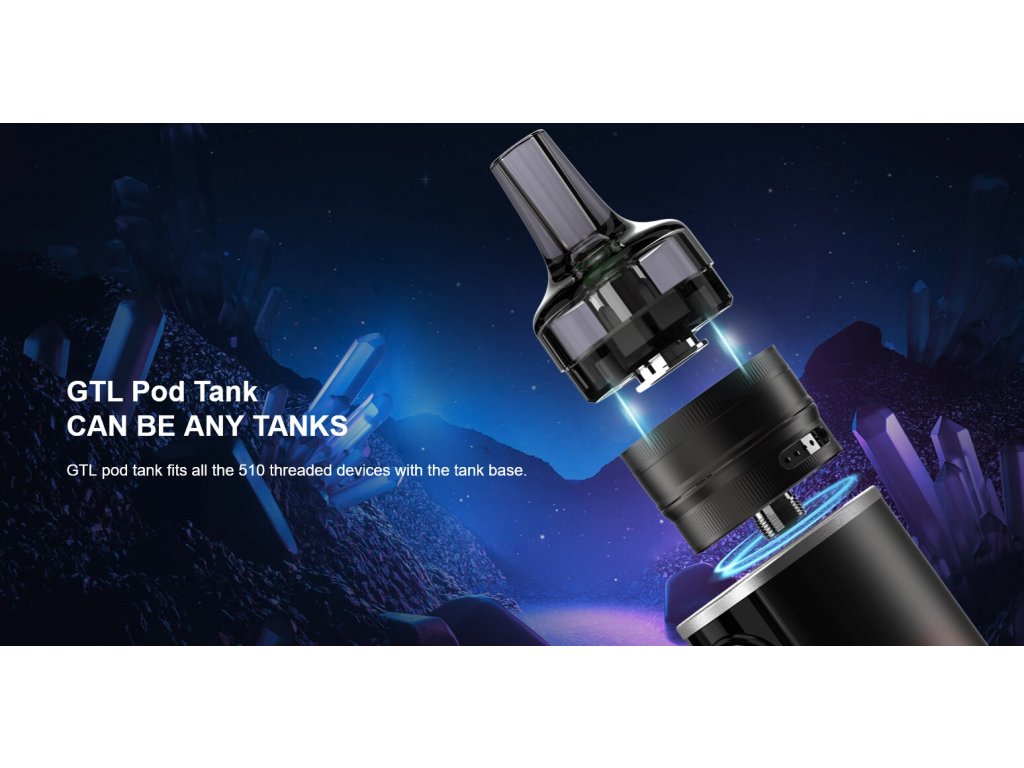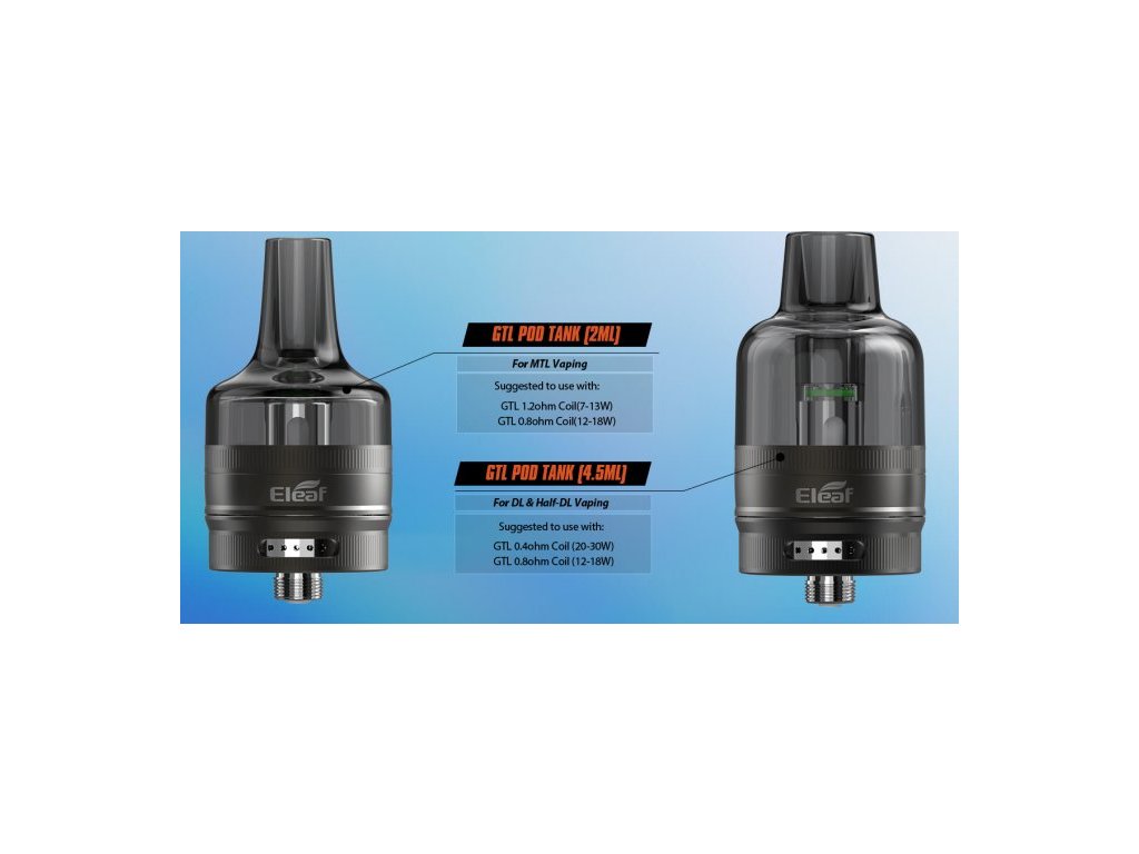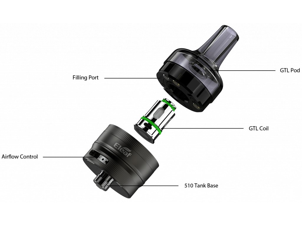 Clearomizér GTL Pod s klasickým 510 závitem je praktický clearomizér od společnosti Eleaf. Plastové tělo PCTG se základnou z nerez oceli pojme až 4,5ml e-liquidu a je vhodný pro DL vaping (přímé potahování do plic). V základním balení budete mít na výběr dvě žhavící hlavy, a to GTL o odporu 0,4ohm a 0,8ohm. Regulace přívodu vzduchu pro nastavení optimální kouřivosti se nachází ve spodní části.