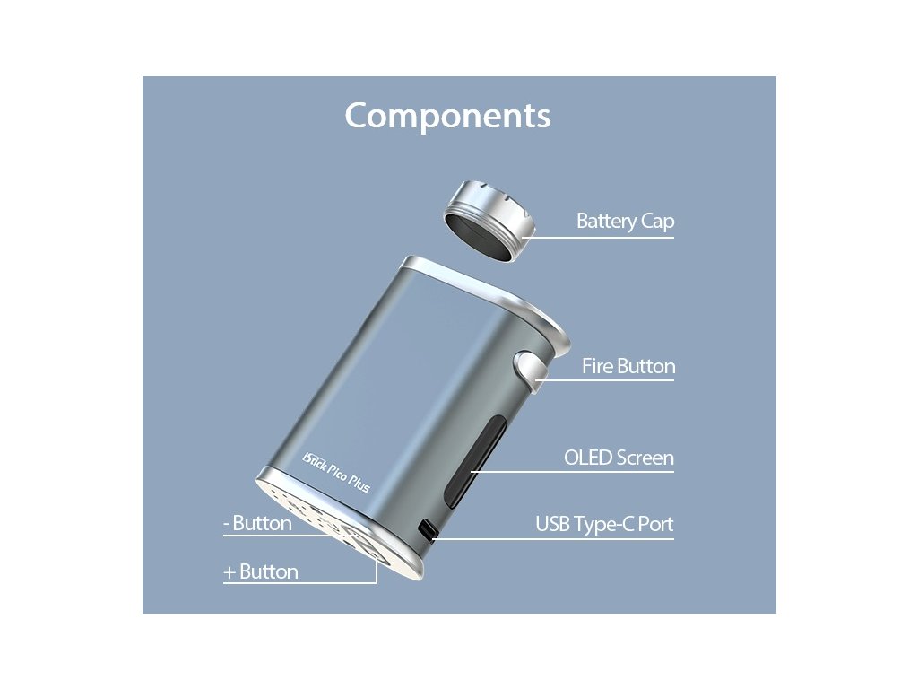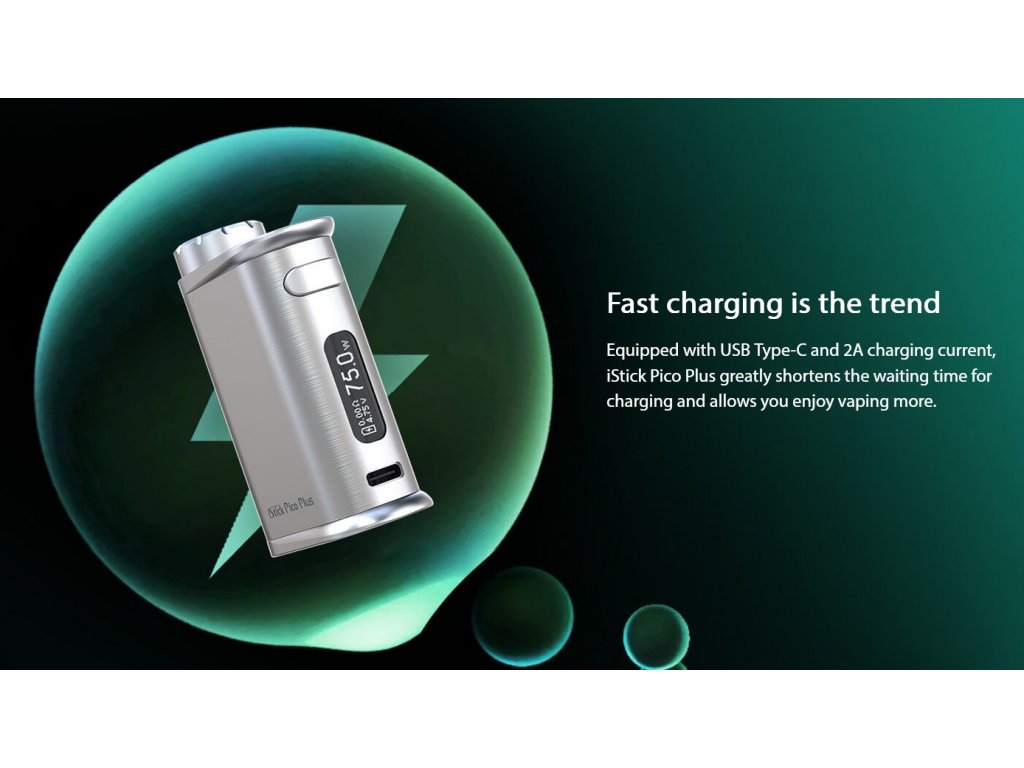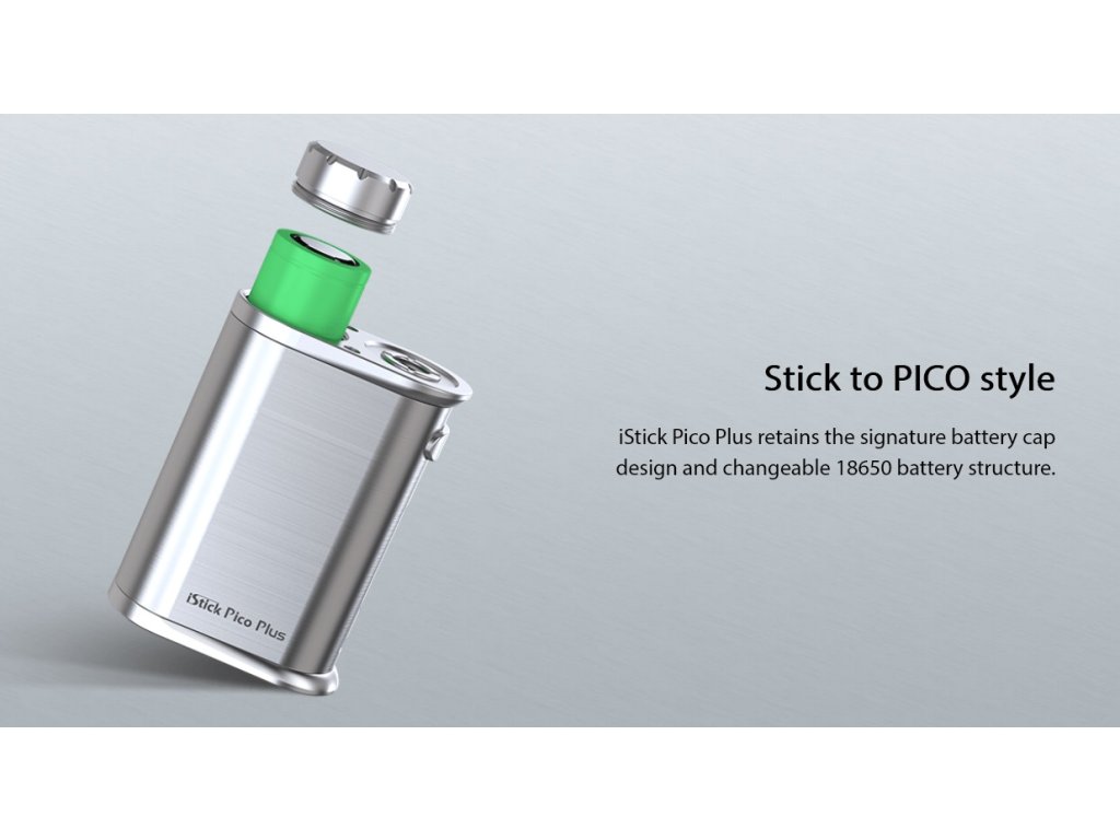 Nový přírůstek do rodiny iStick MODů na to jde zase trochu jinak než jeho předchůdci a vestavěnou baterii nahradila vyměnitelná 18650. Ta se díky vrchnímu šroubování velice snadno vyměňuje a kdykoliv ji tak můžete vyměnit za plně nabitou. A pokud byste náhodou neměli možnost nabíjet baterie externě, nemusíte zoufat, iStick Pico má USB-C port, přes který baterii pohodlně nabijete a ještě přitom můžete e-cigaretu používat.