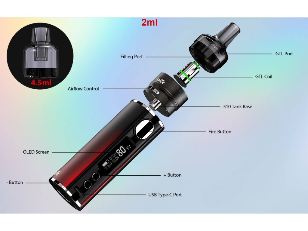 Populární grip iStick T80 se představuje v novém barevném kabátě s novým clearomizérem GTL Pod. Celokovové tělo ukrývá vestavěnou baterii o kapacitě 3000mAh, která je podporována inovativním systémem rychlého nabíjení QC3.0 s dobou nabíjení pouhých 90-ti minut. iStick T80 nabízí nastavitelný výkon až 80W. Přehledný OLED displej nabízí detailní informace o nastavení. Mezi jeho další přednosti patří ochrana proti zkratu, přehřátí, přežhavení, nízkému odporu a 10-ti vteřinová ochrana žhavení. Clearomizér GTL Pod je vybaven klasickým 510 závitem a inovativním spodním plněním. Plastové tělo PCTG se základnou z nerez oceli pojme až 4,5ml e-liquidu a je vhodný pro DL vaping. V základním balení budete mít na výběr dvě žhavící hlavy, a to GTL o odporu 0,4ohm a 0,8ohm. Regulace přívodu vzduchu pro nastavení optimální kouřivosti se nachází ve spodní části.