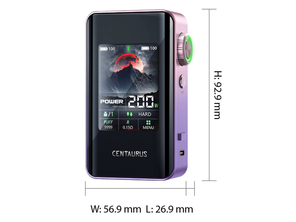 Lost Vape Centaurus BT200 je špičkově navržený box mod plný pokročilých technologií a bohatých funkcí, které dokáží oslovit naprosto všechny příznivce pokročilého vapování. Personalizujte si svůj požitek z vapování díky modernímu čipsetu Quest X 3.0 a inteligentnímu připojení Bluetooth a užívejte si všechny výhody modu naplno. Najděte si svůj výstupní režim díky bohaté nabídce až sedmi režimů a zažijte maximální výkon díky pohonu na dvě externí baterie 18650 a maximálnímu výkonu až 200 W. Mějte přehled o všech potřebných parametrech s masivním celobarevným TFT 2.4" displejem a vychutnejte si pohodlnou uživatelskou obsluhu s intuitivním ovládacím tlačítkem 3v1 a přepínatelnými UI. Lost Vape Centaurus BT200 představuje to nejlepší ze současné nabídky tohoto výrobce a ukazuje, že vaping může být opravdovou zábavou.