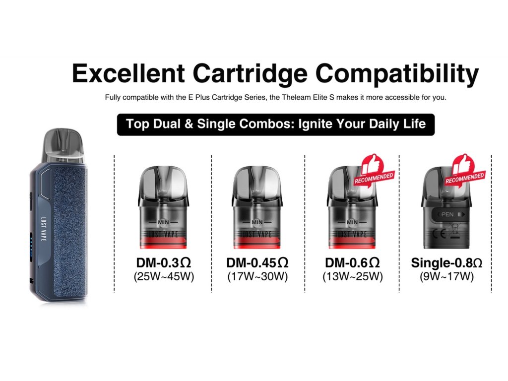 Lost Vape Thelema Elite S je odlehčenější verzí a jakousi fúzí modelů Thelema Nano a Thelema Elite 40. Toto rafinované zařízení nabídne jednoduché přepínání výstupního výkonu prostřednictvím funkce výstupních režimů intenzity BOOST a ECO, to vše za podpory cartridgí Lost Vape E-Plus Dual Mesh se dvěma samostatnými mesh pásky v jádru. Nesmí chybět ani upgradovaná technologie E-Core Tech 3.0 Dual Mesh pro zesílený hit při potahu, výraznější chuťovou prokreslenost a delší životnost. Snadné přepínání intenzity a praktické automatické funkce této e-cigarety jsou ideálním řešením jak pro začínající uživatele, tak také pro nenáročné vapery, kteří hledají perfektně funkční a jednoduché zařízení od renomovaného výrobce.
