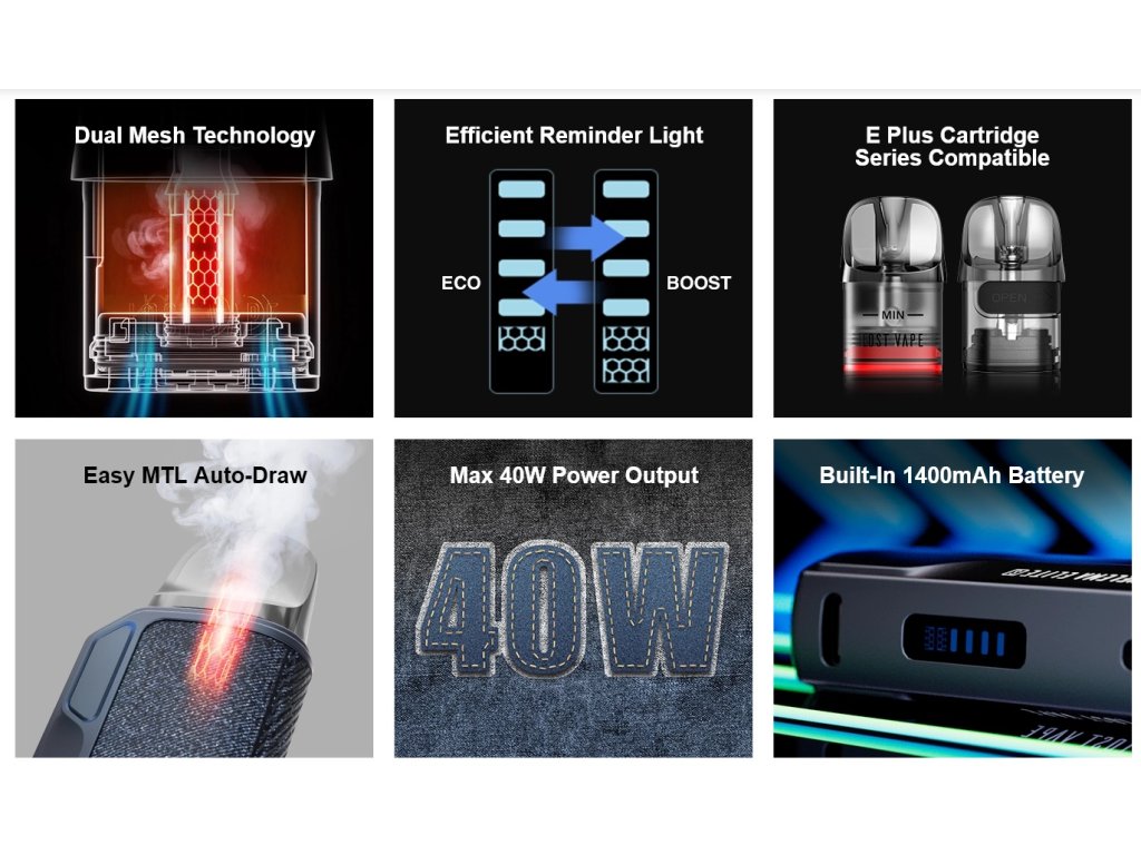Technologie E Core Tech 3.0 Dual Mesh - Užijte si bohatou a mnohovrstevnatou chuť při každém potahu díky inovativní technologii E-Core Tech 3.0, kterou jsou opatřeny cartridge E-Plus Dual Mesh. Až o 200% silnější hit, o 100% vyšší chuťová reálnost a věrohodnost a o 60% vyšší produkce páry. Díky této inovativní technologii došlo také k nárůstu životnosti, která je nyní mnohem delší, než tomu bylo u původních cartridgí E-Plus.