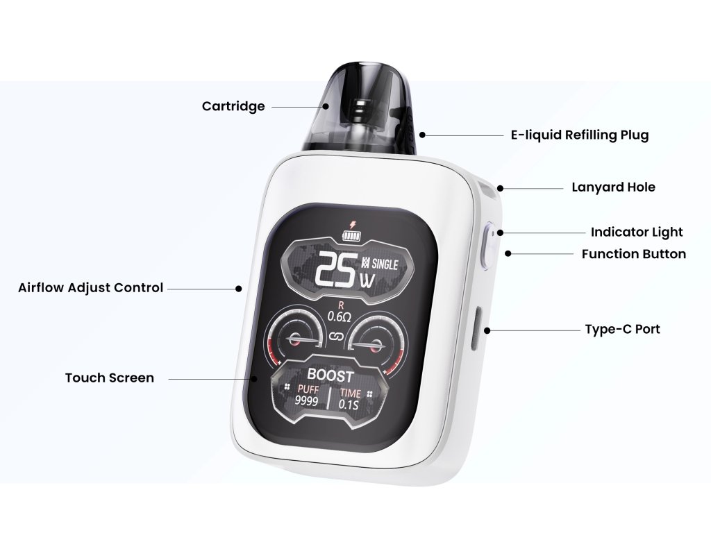 Ursa Baby 3 Pro od značky Lost Vape přináší přepracovaný koncept ovládání s plně integrovaným all-in-one dotykovým systémem. Barevný dotykový displej umožňuje intuitivní nastavení výkonu, zobrazení dat v reálném čase, přístup k interaktivnímu menu a dynamické vizuální efekty, které zvyšují komfort obsluhy i celkový uživatelský zážitek. Integrovaná baterie s kapacitou 1300mAh nabízí stabilní a konzistentní výkon v rozsahu až 35W, což zajišťuje spolehlivý MTL–RDL projev napříč různými typy cartridgí. Díky plné kompatibilitě s celou sérií Ursa Cartridge mají uživatelé i prodejci k dispozici široký výběr odporů a možností využití podle preferovaného stylu vapování. Výrazným technologickým posunem je podpora Bluetooth 5.0, která umožňuje chytré propojení zařízení, funkce proti ztrátě, optimalizace firmwaru v rámci propojeného ekosystému a personalizaci nastavení. Kompaktní tělo z odolné zinkové slitiny si zachovává prémiový vzhled značky Lost Vape a zároveň zůstává lehké a vhodné pro každodenní přenášení. Součástí balení jsou 2ml top-fill cartridge s konstrukcí zaměřenou na minimalizaci protékání, přesnou regulaci airflow a stabilní přenos výkonu. V kombinaci s inteligentními ochrannými prvky přináší Ursa Baby 3 Pro vyšší uživatelský komfort, chytřejší ovládání a celkově vylepšený výkon v rámci řady Ursa Baby.