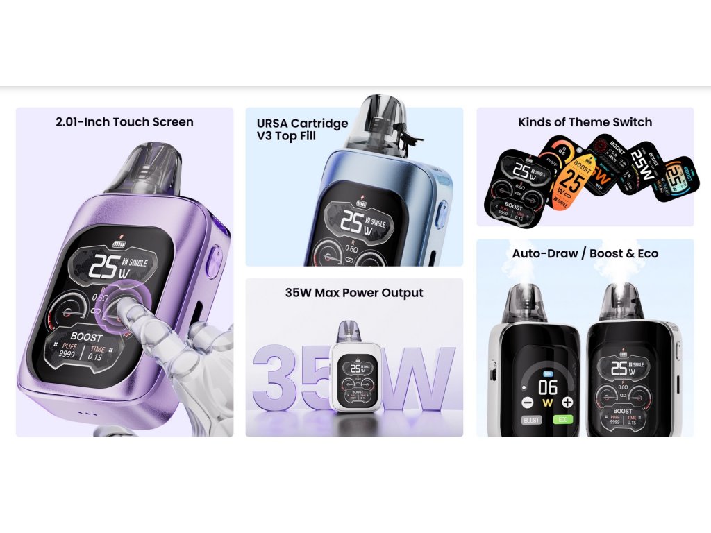 Ursa Baby 3 Pro od značky Lost Vape přináší přepracovaný koncept ovládání s plně integrovaným all-in-one dotykovým systémem. Barevný dotykový displej umožňuje intuitivní nastavení výkonu, zobrazení dat v reálném čase, přístup k interaktivnímu menu a dynamické vizuální efekty, které zvyšují komfort obsluhy i celkový uživatelský zážitek. Integrovaná baterie s kapacitou 1300mAh nabízí stabilní a konzistentní výkon v rozsahu až 35W, což zajišťuje spolehlivý MTL–RDL projev napříč různými typy cartridgí. Díky plné kompatibilitě s celou sérií Ursa Cartridge mají uživatelé i prodejci k dispozici široký výběr odporů a možností využití podle preferovaného stylu vapování. Výrazným technologickým posunem je podpora Bluetooth 5.0, která umožňuje chytré propojení zařízení, funkce proti ztrátě, optimalizace firmwaru v rámci propojeného ekosystému a personalizaci nastavení. Kompaktní tělo z odolné zinkové slitiny si zachovává prémiový vzhled značky Lost Vape a zároveň zůstává lehké a vhodné pro každodenní přenášení. Součástí balení jsou 2ml top-fill cartridge s konstrukcí zaměřenou na minimalizaci protékání, přesnou regulaci airflow a stabilní přenos výkonu. V kombinaci s inteligentními ochrannými prvky přináší Ursa Baby 3 Pro vyšší uživatelský komfort, chytřejší ovládání a celkově vylepšený výkon v rámci řady Ursa Baby.