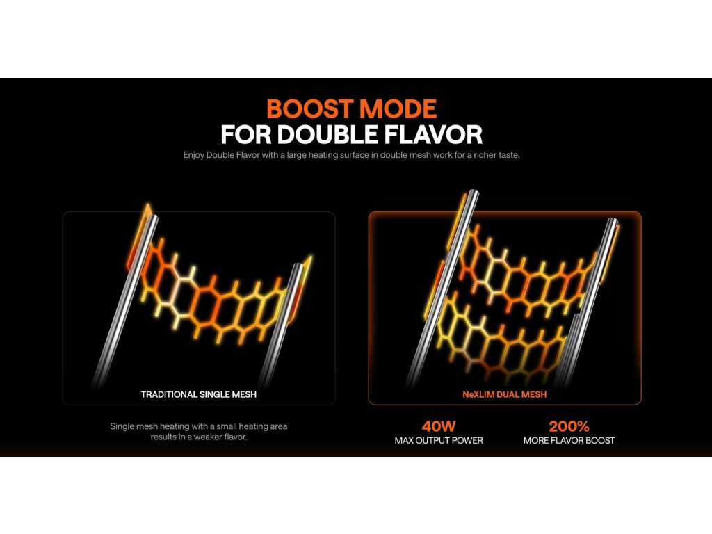 Na výběr máte ze dvou režimů. Zatímco ECO režim Vám ušetří baterii a prodlouží vapování na jedno nabití, s Boost režimem si dopřejete vyšší výkon a s tím i teplejší a bohatší páru, obzvláště pak ve spojení s přímými potahy do plic.