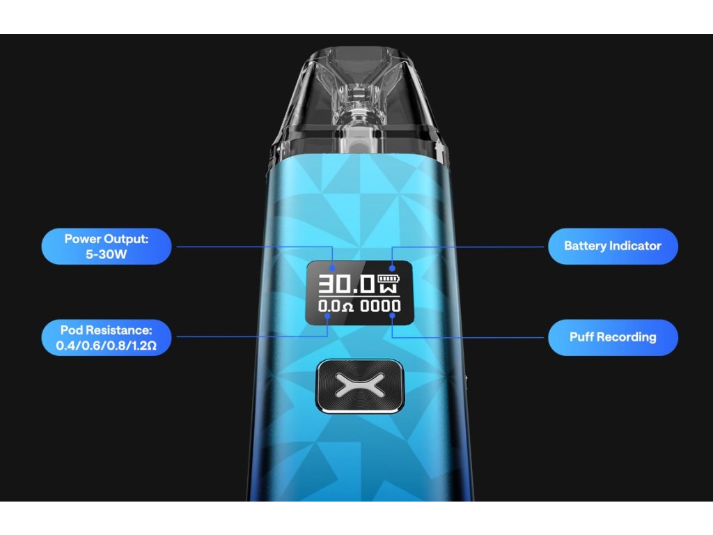 * Zařízení disponuje funkcí inteligentní detekce odporu, po připojení cartridge omezí nastavitelný rozsah výkonu podle odporu připojené cartridge. Výkon 30W lze používat s cartridgí Xlim V3 0.4Ω, která není součástí základního balení.