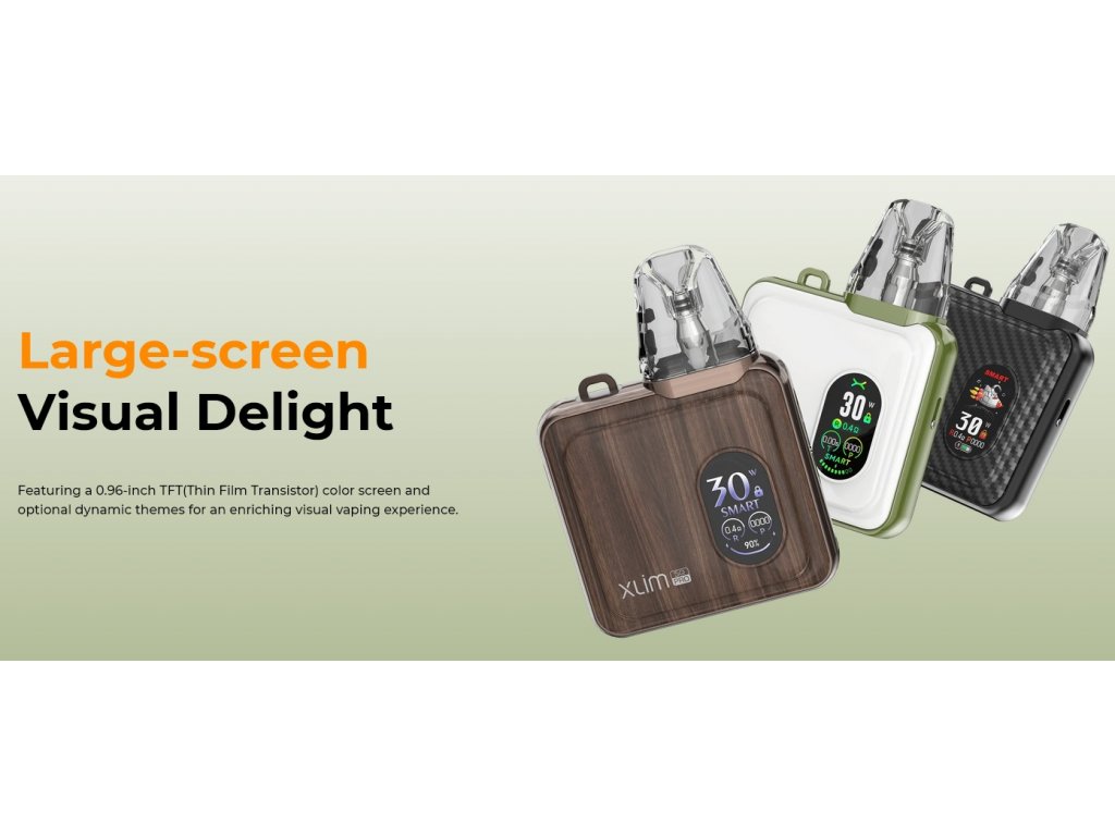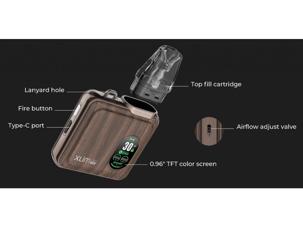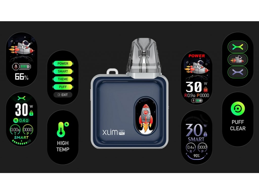 Boční část disponuje krásným barevným TFT displejem, na kterém budete mít neustálý přehled o nastavených parametrech, nebo o počtu potahů, nastaveném výkonu a stavu baterie. Xlim SQ Pro nabídne také přehledné uživatelské rozhraní a velice snadné ovládání, v nabídce na displeji se pohybujete pomocí jednoho tlačítka, vše máte nastaveno a upraveno během pár vteřin. E-cigareta umožňuje regulaci výkonu v rozpětí 5 - 30 W a volbu výstupního režimu mezi režimem Power, nebo režimem Smart. Mimo tyto funkce nabídne také hned tři hlavní uživatelská témata, můžete tak vybírat z konvenčnějších grafických rozhraní, nebo z těch odvážnějších. Samozřejmostí jsou potom také dvě metody spínání potahu, nebo praktická manuální regulace airflow. Nesmí chybět ani kompatibilita s kompletní platformou cartridgí Xlim Pod. Osvědčené cartridge Xlim V3 Top Fill najdete také v základním balení, postarají se o mimořádný chuťový zážitek a ještě umocní celkové kvality zařízení SQ Pro. Model OXVA Xlim SQ Pro Pod je určen všem milovníkům MTL šlukování, kteří se poohlíží po velice stylovém zařízení nabitém funkcemi a s jedinečným zpracovaním.