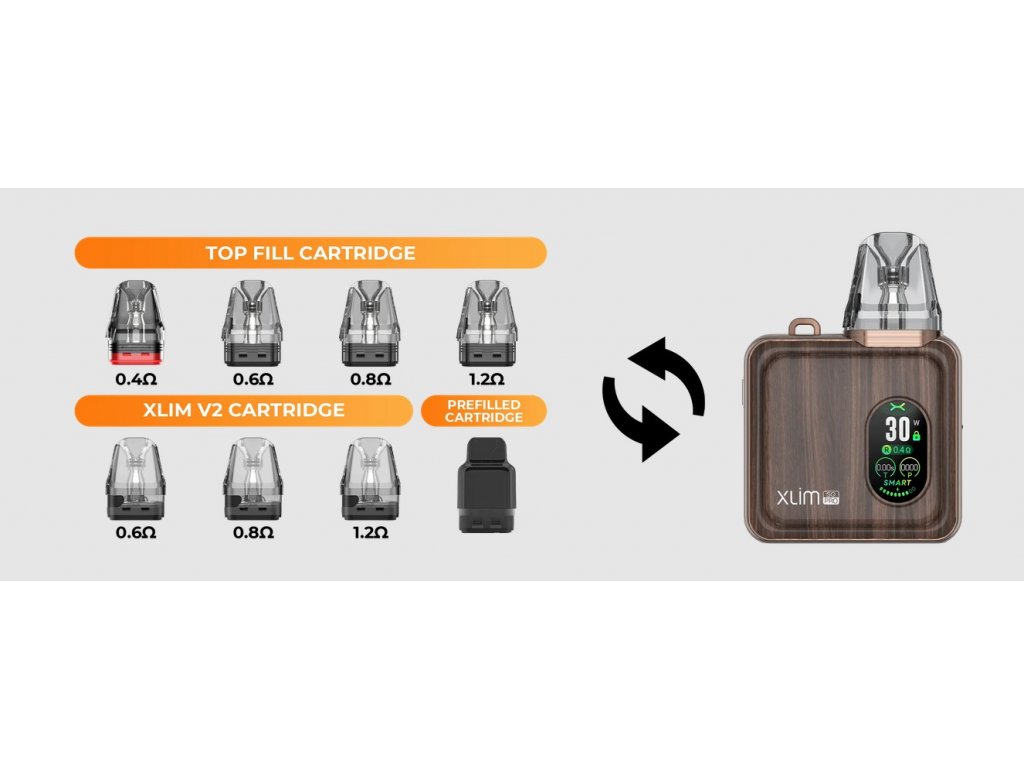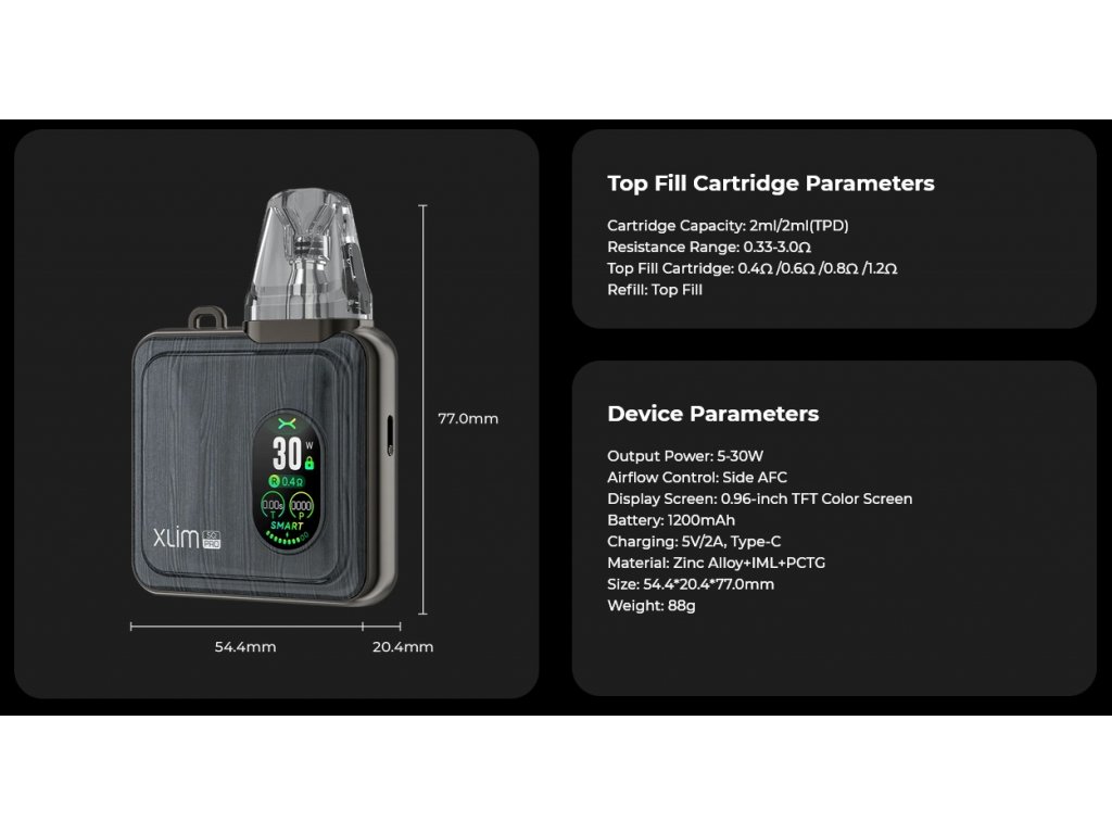 Přepracovaný design: Do detailu promyšlený design, kvalitní použité materiály a jedinečná povrchová úprava. OXVA Xlim SQ Pro Pod Kit spojuje užitečné funkce a překrásné zpracování do jednoho jediného těla, přináší tak mimořádný požitek z vapingu, který lahodí také oku. Samozřejmostí je potom zachování tradiční krabičkové konstrukce s kompaktními rozměry, které se zastavily na 77 x 54.4 x 20.4 mm.