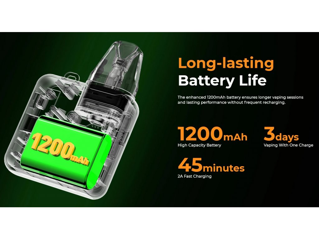 Obrovská kapacita baterie: Ke změně nedošlo jen u designu, ale také u kapacity samotné baterie. Výrobce osadil model SQ Pro integrovanou baterií s ohromující kapacitou 1200 mAh. Už po prvních hodinách intenzivního vapování dokážete zaznamenat, jak je celková výdrž baterie efektivní a dlouhá. Sympatickým doplňkem modelu je potom zároveň podpora rychlého nabíjení USB-C proudem až 2A, pokud se vám baterie vybije, postačí vám na dobití pouhých 45 minut.