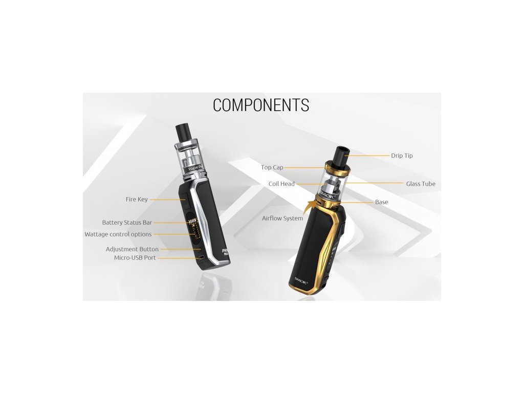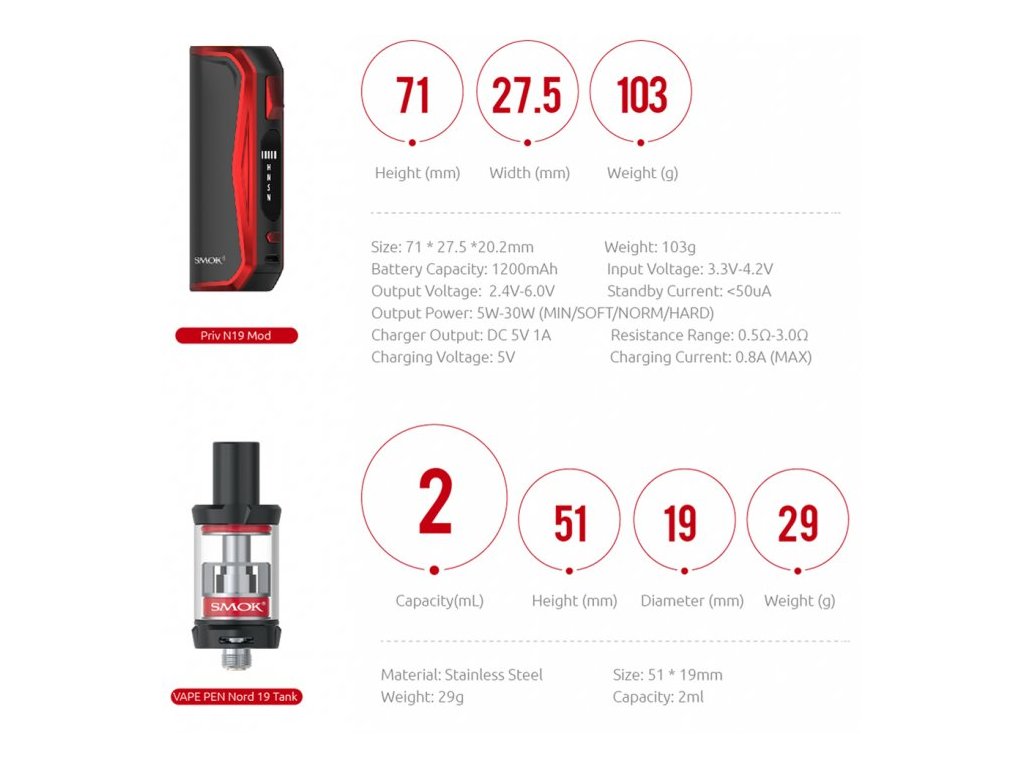 Priv N19 je nejnovějším a nejpropracovanějším přírůstkem této oblíbené řady gripů od Smoktechu. Vestavěná baterie o kapacitě 1200mAh je vybavena přehledným LED indikátorem stavu nabití. Grip nabízí čtyři možnosti nastavění výkonu až do 30W, a to MIN/SOFT/NORM a HARD. Mezi jeho další přednosti patří ochrana proti zkratu a přehřátí nebo osmi vteřinová ochrana žhavení. Clearomizér Nord 19 je osazen žhavícími hlavami Nord, které se osvědčili ve stejnojmenné e-cigaretě. Odpor 1,4ohm je pak ideální kompromis k produkci páry a skvělému podání chuti. Náustek je pevnou součástí vrchní krytky clearomizéru, po jehož odšroubování lze jednoduše doplnit až 2ml e-liquidu. Tank lze pak regulovat spodním přívodem vzduchu.
