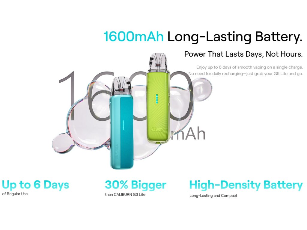 Caliburn G5 Lite SE od značky Uwell kombinuje prémiové materiály, moderní design a dlouhou výdrž v kompaktním těle vhodném pro každodenní provoz. Konstrukce z PC materiálu doplněná o kožený povrch zajišťuje příjemný úchop, odolnost a zároveň nízkou hmotnost, což z přístroje dělá praktickou volbu do kapsy i batohu. Integrovaná vysokokapacitní baterie 1600mAh poskytuje stabilní výkon až 35W a umožňuje několikadenní používání bez nutnosti častého dobíjení. Technologie PRO-FOCS 4.0 zajišťuje čisté podání chuti, optimalizovaný přenos výkonu a delší životnost cartridge, což je klíčové zejména z pohledu dlouhodobé spokojenosti uživatelů. Zařízení je vybaveno duálním systémem regulace airflow – jemné doladění tahu je možné jak posuvným ovladačem, tak otočením cartridge. Díky tomu lze snadno přepínat mezi utaženým MTL a volnějším RDL stylem vapování bez nutnosti výměny komponentů. Přehledný 4-Bar Gradient LED indikátor reaguje na potah a současně informuje o stavu baterie v reálném čase. Součástí balení je cartridge Caliburn GPP s odporem 0.6ohm a bočním plněním o objemu 2ml, navržená pro plynulý chod, minimální riziko protékání a konzistentní výkon při každodenním používání. Zařízení je plně kompatibilní s celou řadou cartridgí Caliburn GPP, což zvyšuje flexibilitu nabídky na prodejně.