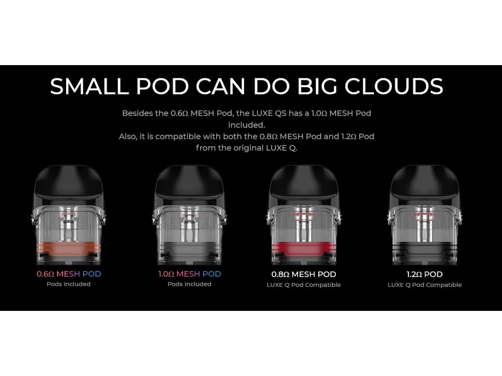 Vaporesso Luxe QS je kompaktní POD systém, který podporuje RDL vapování - poskytuje to nejlepší z MTL a DL vapování. Výrobce toto zařízení označuje jako ,,CUTE BUT STRONG´´ roztomilý, ale silný. Ergonomický tvar baterie padne do dlaně jako ulitý a díky nové technologii COREX Heating Tech si tak užijete příjemný vaping v kombinaci husté páry a vyladěné chuti e-liquidu. Vestavěná baterie disponuje kapacitou 1000mAh s USB-C nabíjením. Vyměnitelné cartridge (POD) o objemu 2ml nabízí oblíbený odpor 0,6ohm a 1ohm a jsou plne kompatibilní s cartridgemi Luxe Q.