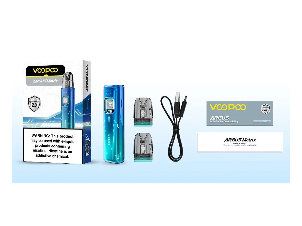 VOOPOO ARGUS Matrix Pod Kit přináší moderní design, výkonnou baterii a špičkovou chuť v jednom kompaktním zařízení. Integrovaná 1350mAh baterie zajišťuje dlouhou výdrž, přičemž výkon lze nastavit v rozmezí 10–30W. Zakřivený Curved Full Screen displej s dynamickými “cyber” vizuály zobrazuje všechny důležité údaje přehledně a stylově. Srdcem zařízení je pokročilá iCOSM CODE 2.0 technologie, která poskytuje čistou a stabilní chuť po celou dobu používání, chrání před protékáním až 30 dní a umožňuje dlouhodobou výdrž bez časté údržby. Součástí balení jsou dvě mesh cartridge – 0.4ohm pro RDL a 0.7ohm pro MTL vapování – obě s horním plněním a kapacitou 3ml. Kompaktní tělo z zinkové slitiny v kombinaci s IML povrchovou úpravou nabízí odolnost, nízkou hmotnost a atraktivní vzhled. Smart Airflow Control a automatické spínání potahu (draw-activated firing) přinášejí pohodlné a intuitivní používání.