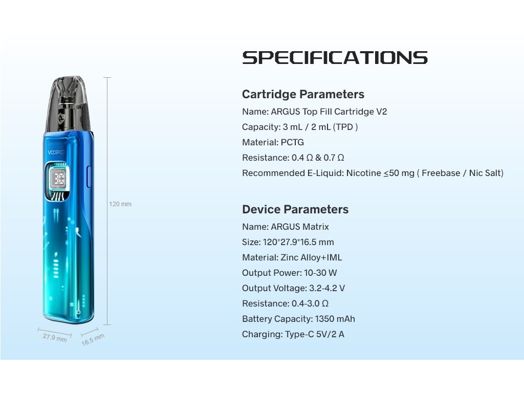 VOOPOO ARGUS Matrix Pod Kit přináší moderní design, výkonnou baterii a špičkovou chuť v jednom kompaktním zařízení. Integrovaná 1350mAh baterie zajišťuje dlouhou výdrž, přičemž výkon lze nastavit v rozmezí 10–30W. Zakřivený Curved Full Screen displej s dynamickými “cyber” vizuály zobrazuje všechny důležité údaje přehledně a stylově. Srdcem zařízení je pokročilá iCOSM CODE 2.0 technologie, která poskytuje čistou a stabilní chuť po celou dobu používání, chrání před protékáním až 30 dní a umožňuje dlouhodobou výdrž bez časté údržby. Součástí balení jsou dvě mesh cartridge – 0.4ohm pro RDL a 0.7ohm pro MTL vapování – obě s horním plněním a kapacitou 3ml. Kompaktní tělo z zinkové slitiny v kombinaci s IML povrchovou úpravou nabízí odolnost, nízkou hmotnost a atraktivní vzhled. Smart Airflow Control a automatické spínání potahu (draw-activated firing) přinášejí pohodlné a intuitivní používání.