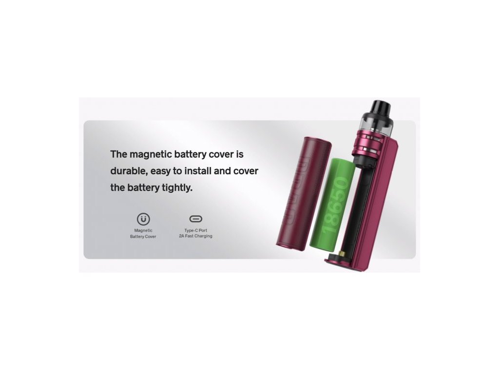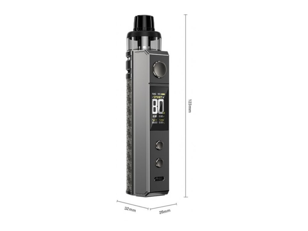 Voopoo Drag H80S se prezentuje především bohatou výrobou mraků a autentickou chutí e-liquidu, a to díky technologii Dual In One = propracovaný přívod vzduchu do horní základny zařízení. Po vložení monočlánku typu 18650 aktivujeme výkonný čip GENE.TT 2.0, který nabízí mody SMART (automaticky nastavuje doporučený výkon podle odporu žhavící hlavy), RBA mod (komplexnější nastavení výkonu) a ECO (při nabití baterie pod 40% možnost šetřícího režimu). Pro jednoduché nastavení hodnot a režimů Vám pomůže 0,96 palcový TFT displej. Čip dále nabízí ochranu proti zkratu, přehřátí a 8-mi vteřinovou ochranu žhavení. Nabíjení zabezpečuje USB-C port. Drag H80S dále představuje novou a propracovanou cartridge PNP Pod II o objemu 4,5ml s vrchním plněním. V této sadě naleznete dvě nové žhavící hlavy PnP - TW30 (0,3ohm) a PnP - TW15 (0,15ohm). Tyto nové žhavící hlavy jsou plně kompatibilní s původní nabídkou série PnP.