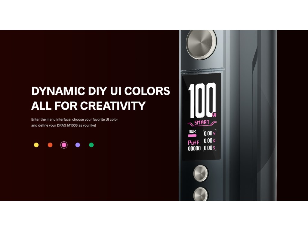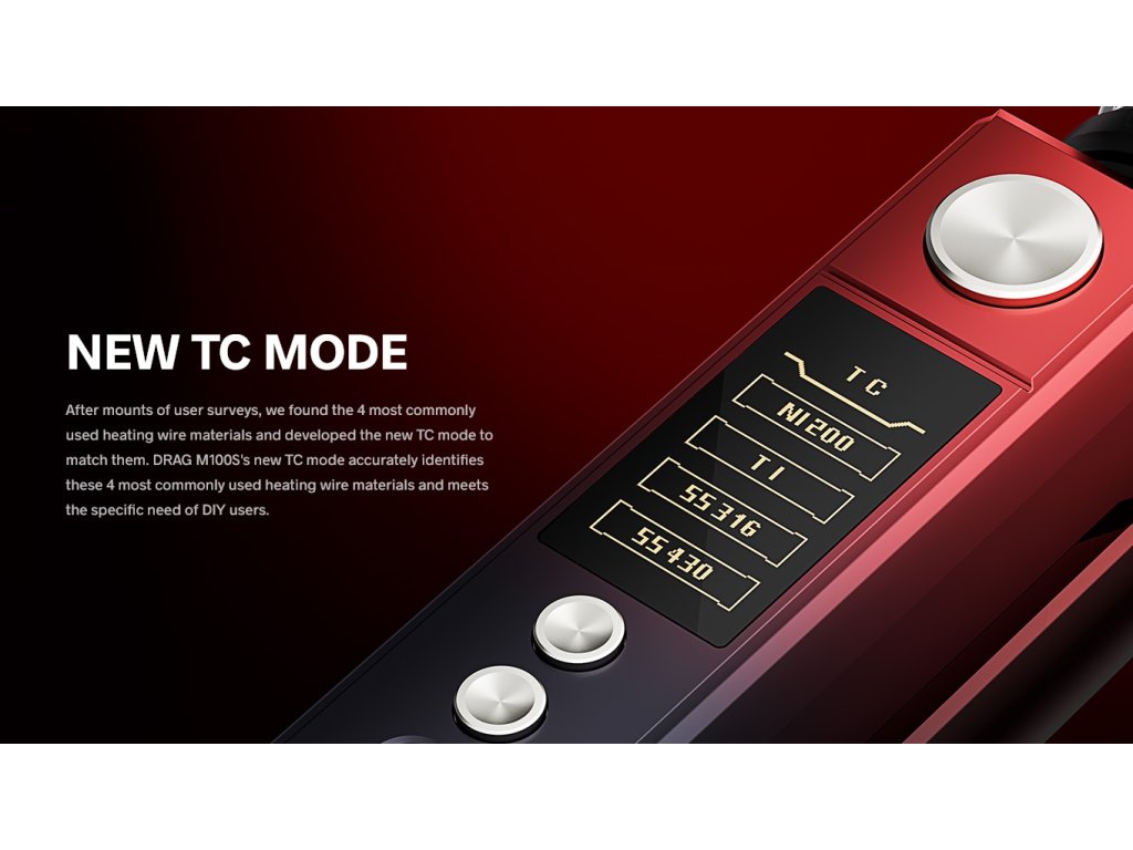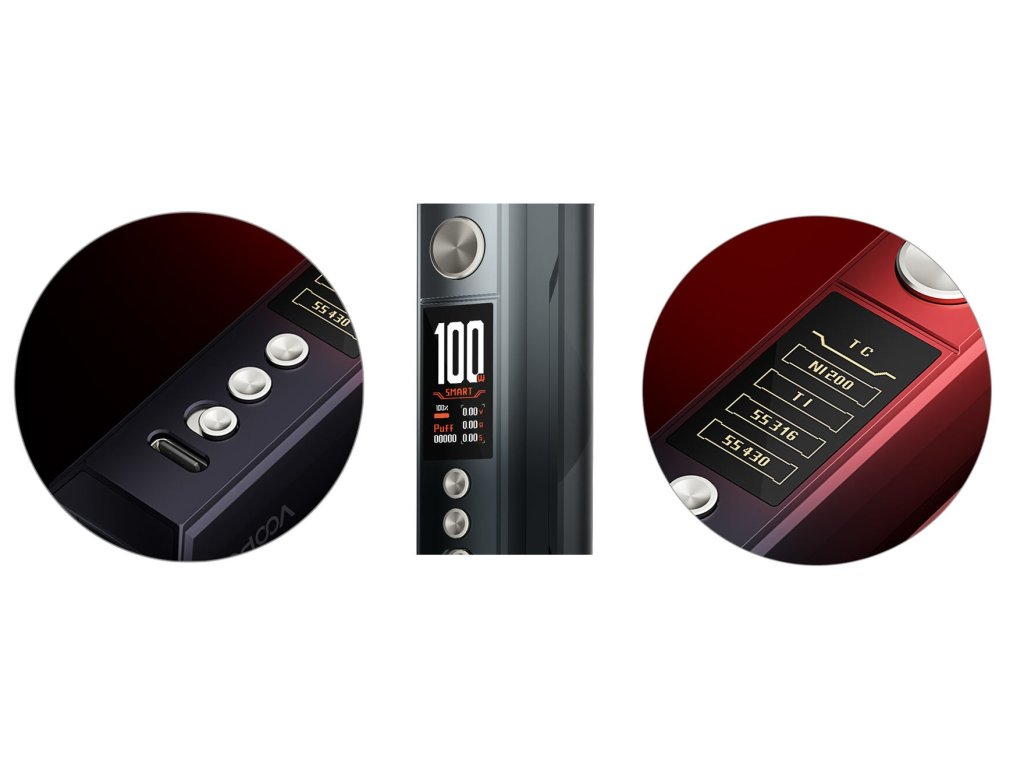 Díky pohonu na jednu baterii si mod poradí s výstupním výkonem až 100 W, výkon lze potom libovolně regulovat v rozpětí 5 - 100 W ve standardním režimu. Tělo modu je poháněno čipsetem GENE TT 2.0, který nabídne pohodlné ovládání, přehledné uživatelské rozhraní, širokou nabídku režimů, skvělý power management a řadu bezpečnostních ochran. Mod lze používat jak s režimem výkonu, tak také v režimu SMART, nebo s teplotními režimy pro niklové, titanové a nerezové spirálky. Vše si pohodlně nastavíte na předním panelu pomocí regulačních tlačítek a velkého displeje. Na předním panelu najdete také dynamický manuální přepínač, který lze nakonfigurovat pro odemykání a zamykání modu, pro zapínání a vypínání modu, nebo pro uzamykání výkonu. Legendární nadčasový design a bohaté funkce, to je VooPoo Drag M100S.